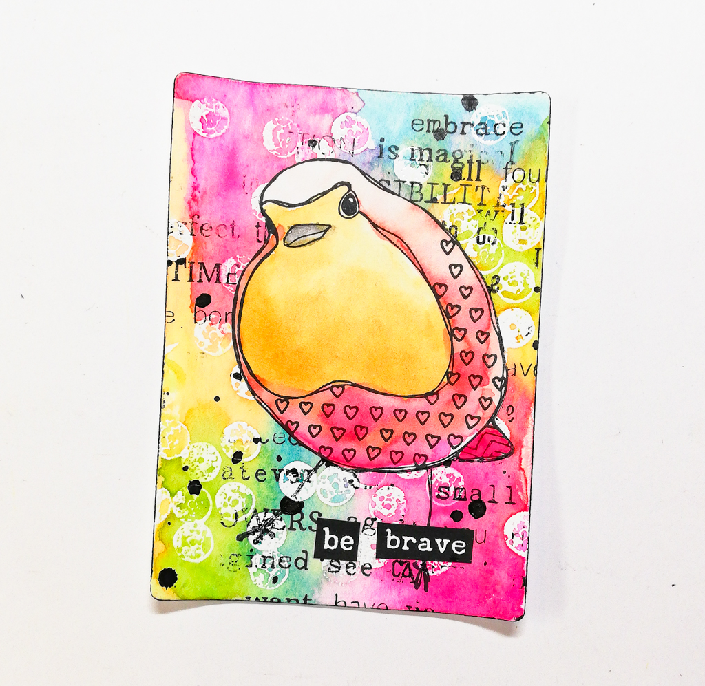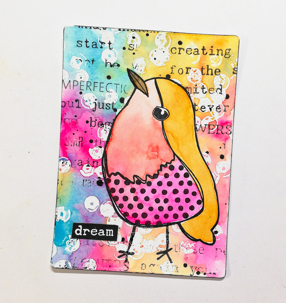 Today I’d like to share three ATCs using my brand new stamps. They have been released yesterday over at Rubber Dance. I played with watercolors to create the background of the cards and embossed one of the Grungy Sequins stamps in white. The birds are stamped to bristol paper and also colored with watercolors.