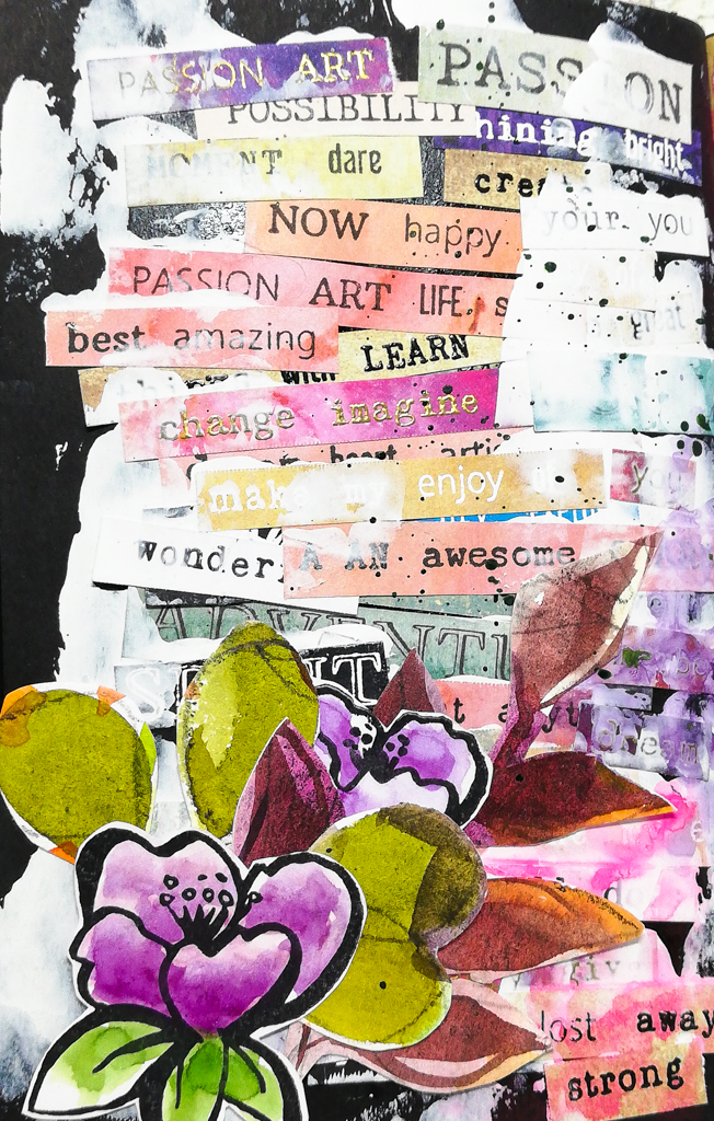 I’m sharing an art journal collage once again. I really enjoy creating art collages from my stash. At the moment I often use cut outs from hand painted watercolor pictures. On this page I also work with my brand new stamps which were just released over at Rubber Dance.