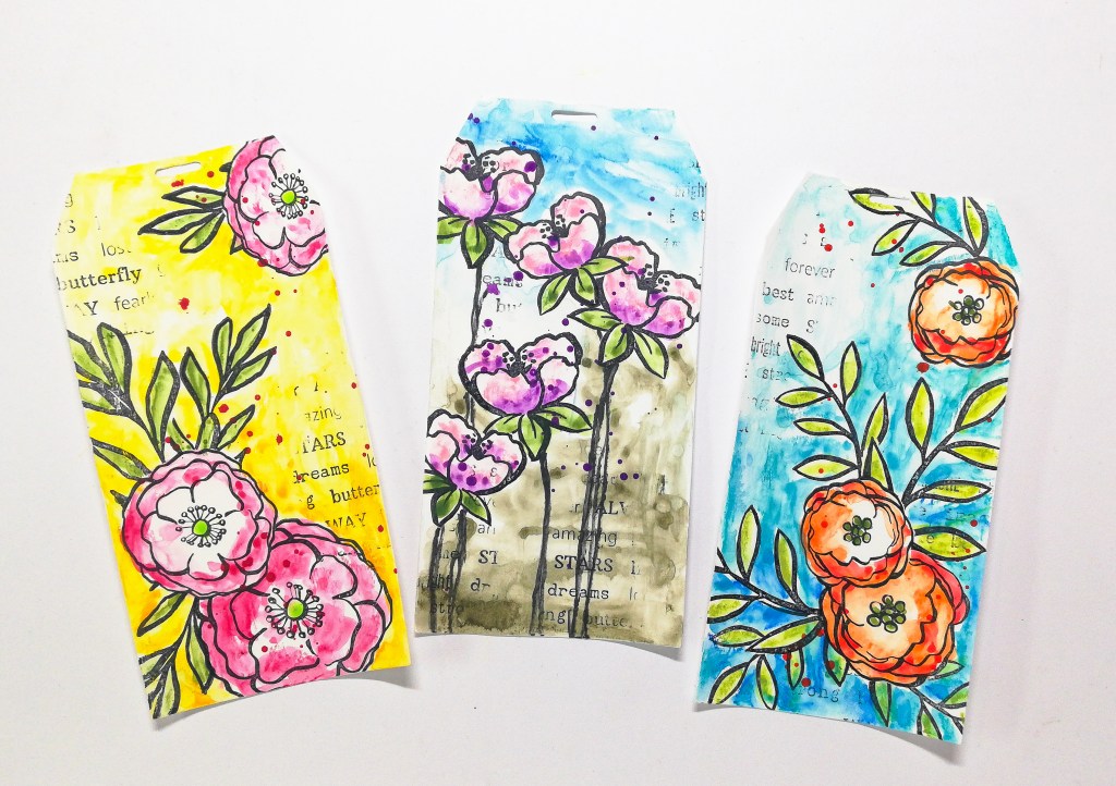 Today I’d like to show you a flower tag trio that I’ve made with my brand new Loose Florals stamp sets. I kept it very simple and used just Neocolor II Crayons with the stamps. To create a layered effect I used the masking technique.
