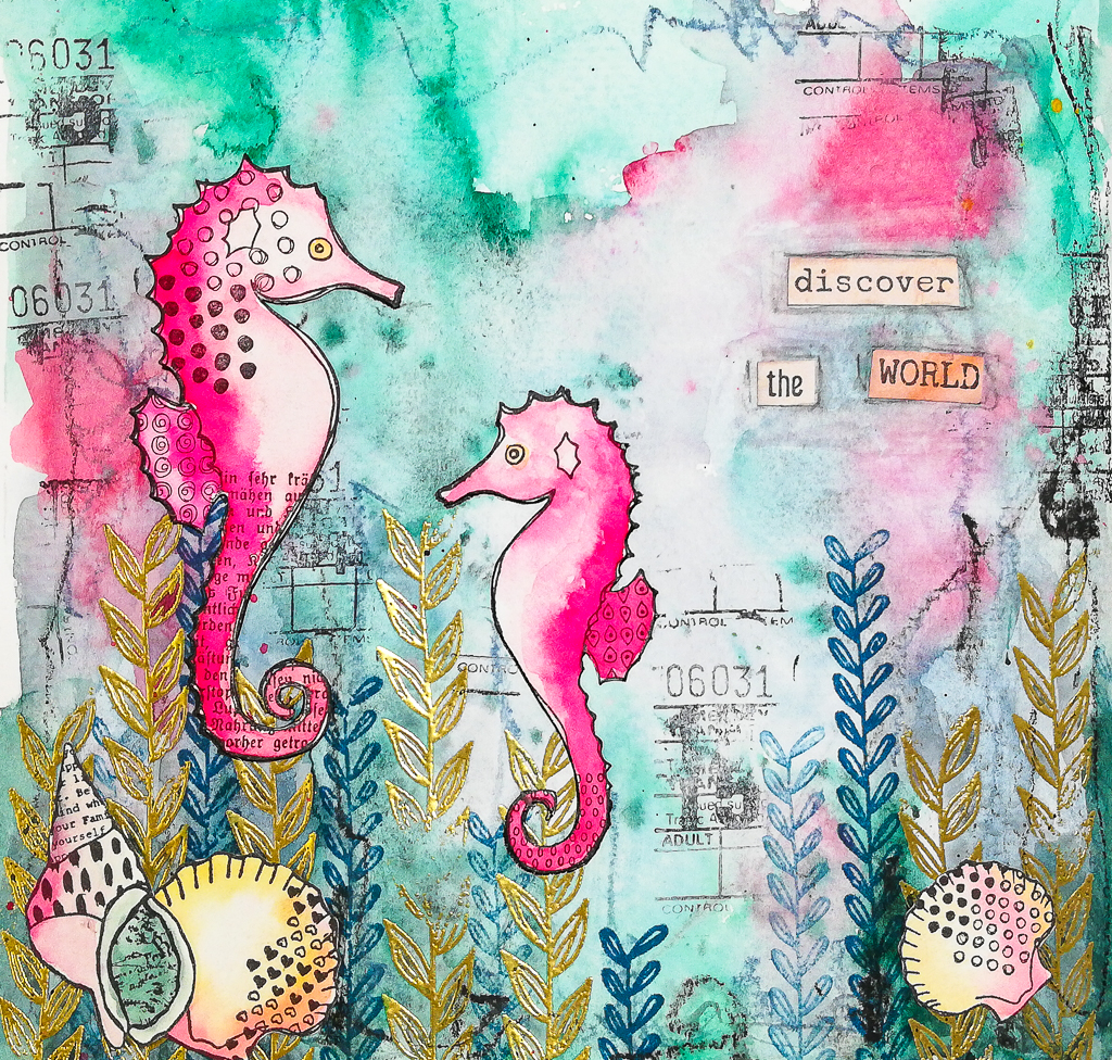 II’m playing in my 6 x 6 watercolor art journal today using watercolors in combination with embossing to create the background. I’m creating an underwater scene with the Textured Sea Creature Stamps from Rubber Dance. I really enjoy the intuitive play with watercolors in my journal. It’s very relaxing and fun.