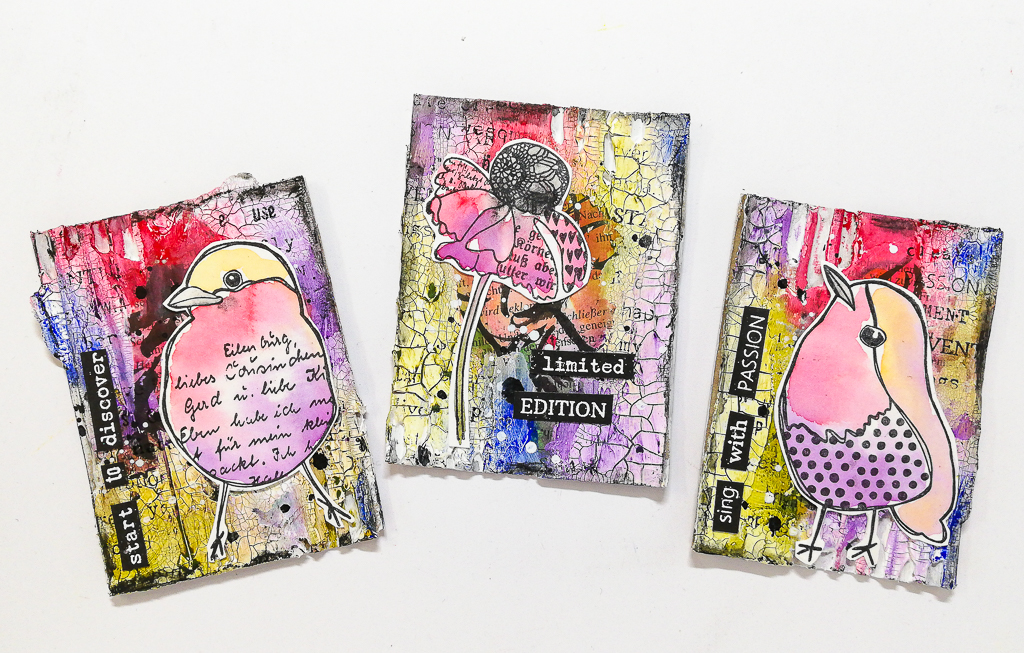 I’m sharing three mixed media artist trading cards today created from some recycled packaging. I started the background with some collaging. For the collage paper I painted an old book page.