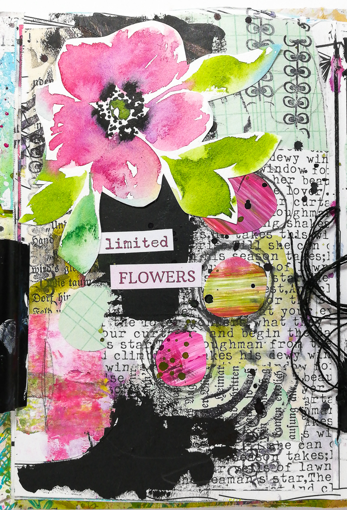 It’s time for a new mixed media collage in my envelope art journal using left over papers, old book pages and some watercolor flower paintings. I really love that intuitive play in my journal and also the fact that those beautiful flowers don’t have to lay in the shelf forever.