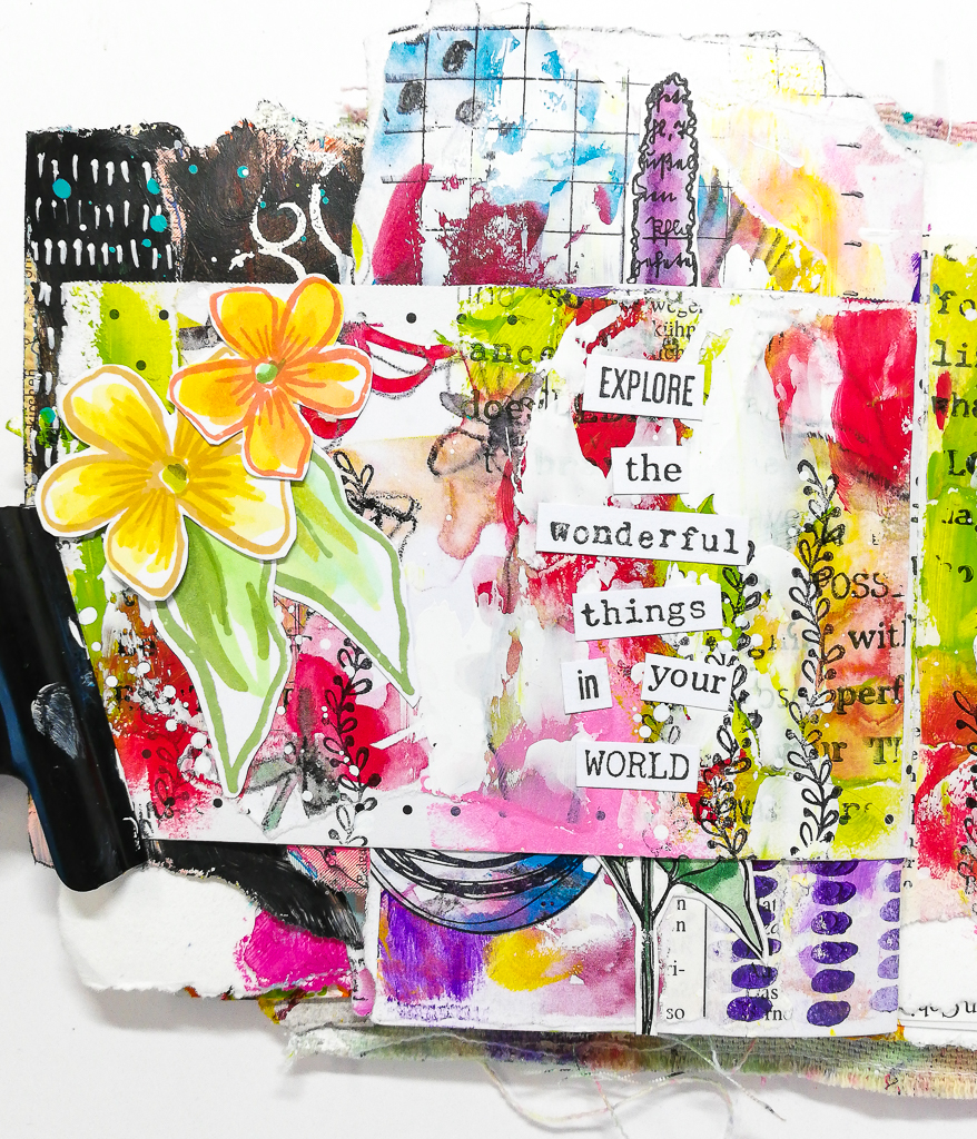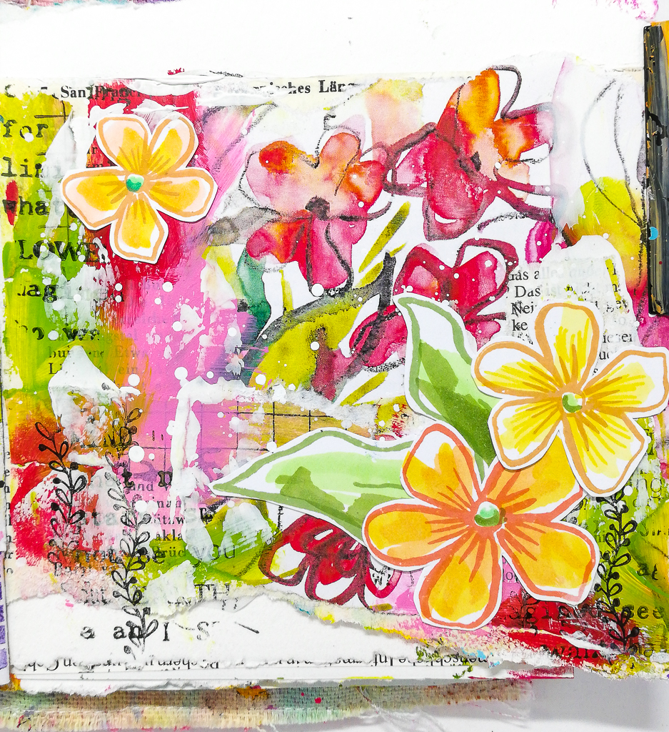 On today’s art journal page I used a digital printable to add some collaging to the background. The paper is free for you to download over on my website. I also used some old book pages and one of my cleaning sheets (papers where I clean my brushes and such).