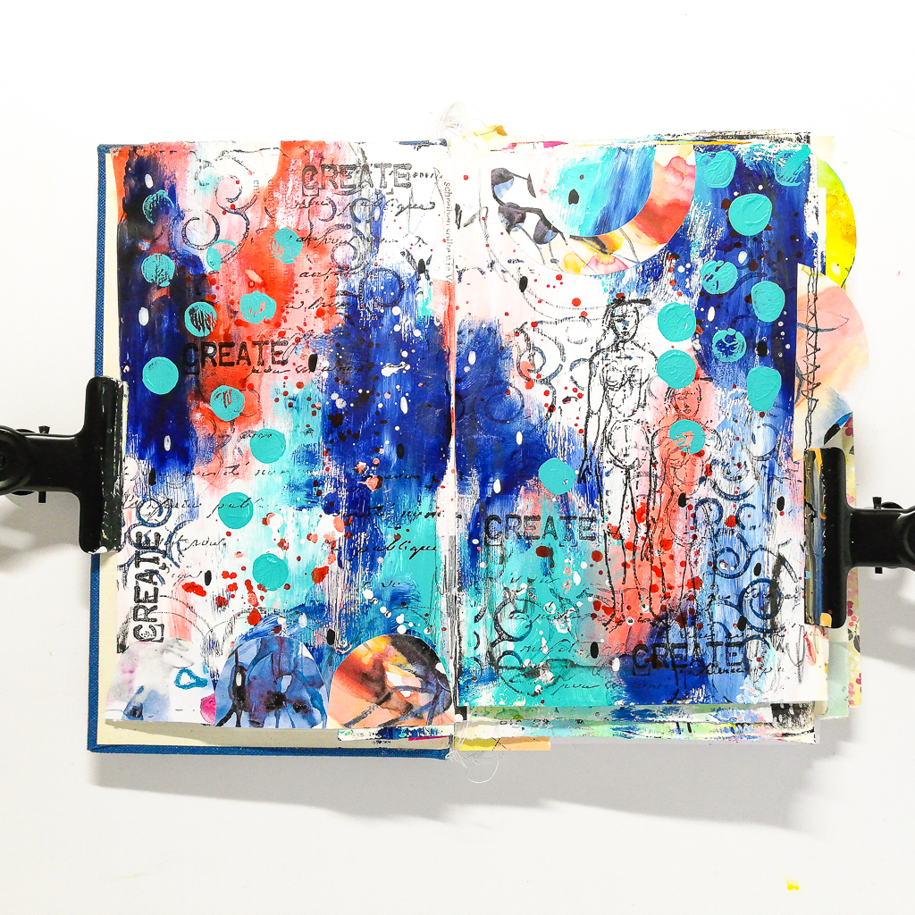 I’m sharing a quick and easy art journal page today. I used only Acrylic Paints together with stamping and a few collage elements. I used one of my free printables which are available to down load here. All stamps I’ve used are from Rubber Dance.