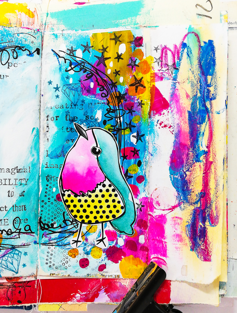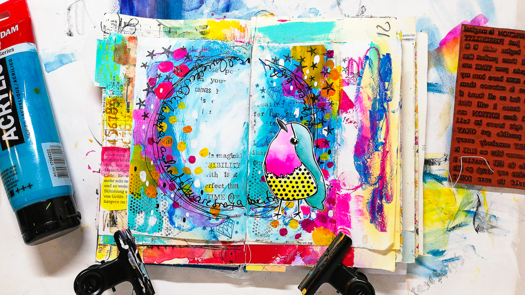 Hi there! I’m sharing a new mixed media art journal tutorial today using acrylic paints to create the background. I combine them a little with Neocolors and uniPosca Markers. I am using one of my Textured Birds stamps as the focal point.