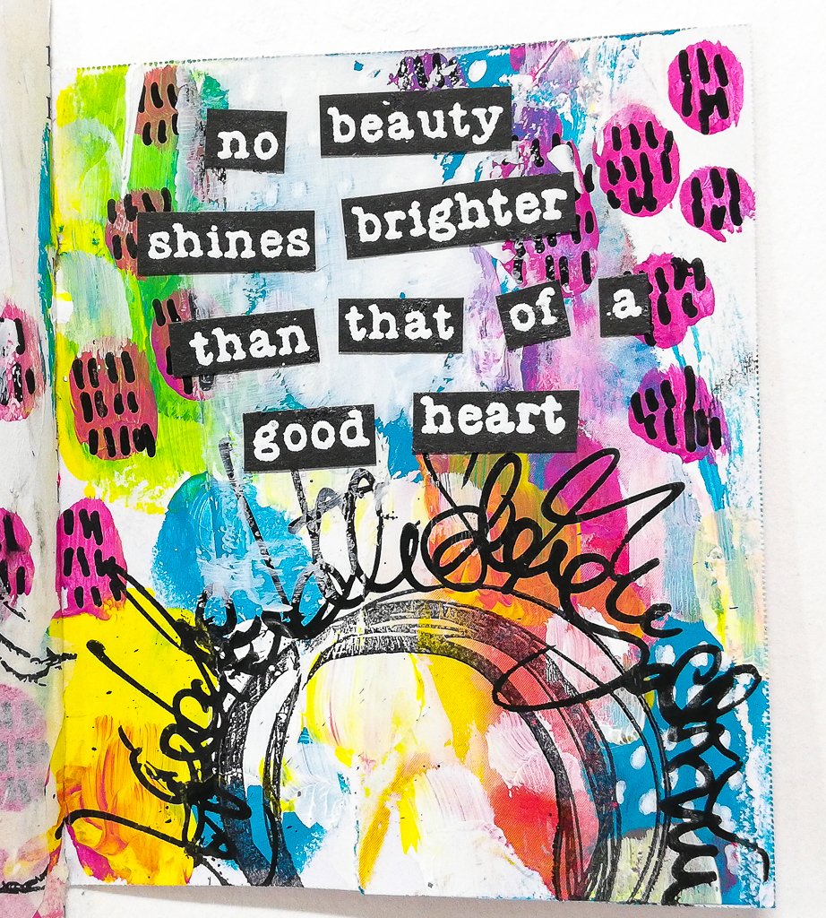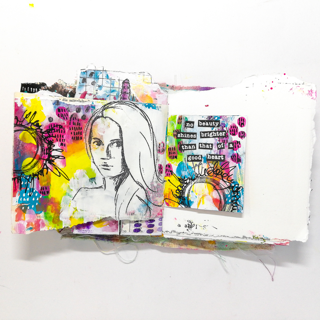 Hi there! Today I’m using on of my free printables for my art journaling tutorial. I created a rainbow background. My main image is the beautiful girl from the Rubber Dance Believe in You stamp set. I stamped it to tissue and adhered it to the page.