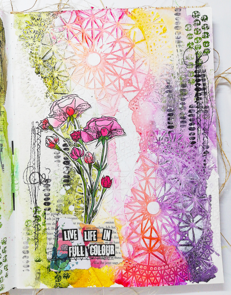 Today I’m sharing a new spread in the Dina Wakley Media Journal. This is one of my favourite journals. I love the size, the different papers and the junky feel it has. I played on the watercolor paper which I have primed with aqua ground. I also added some texture with a stencil and crackle paste to the pages before I started adding my watercolors.