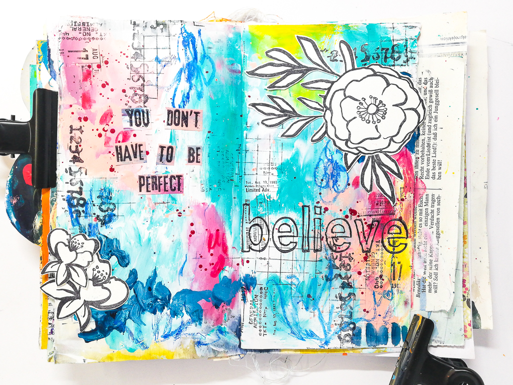 I’m sharing a new art journaling tutorial today using mainly Acrylics for the background. To stamp the flower arrangement I used the masking technique. I stamped the flower to my cardstock and also to a post it note. Then I masked off the flower with the post it note and stamped the leaves around.
