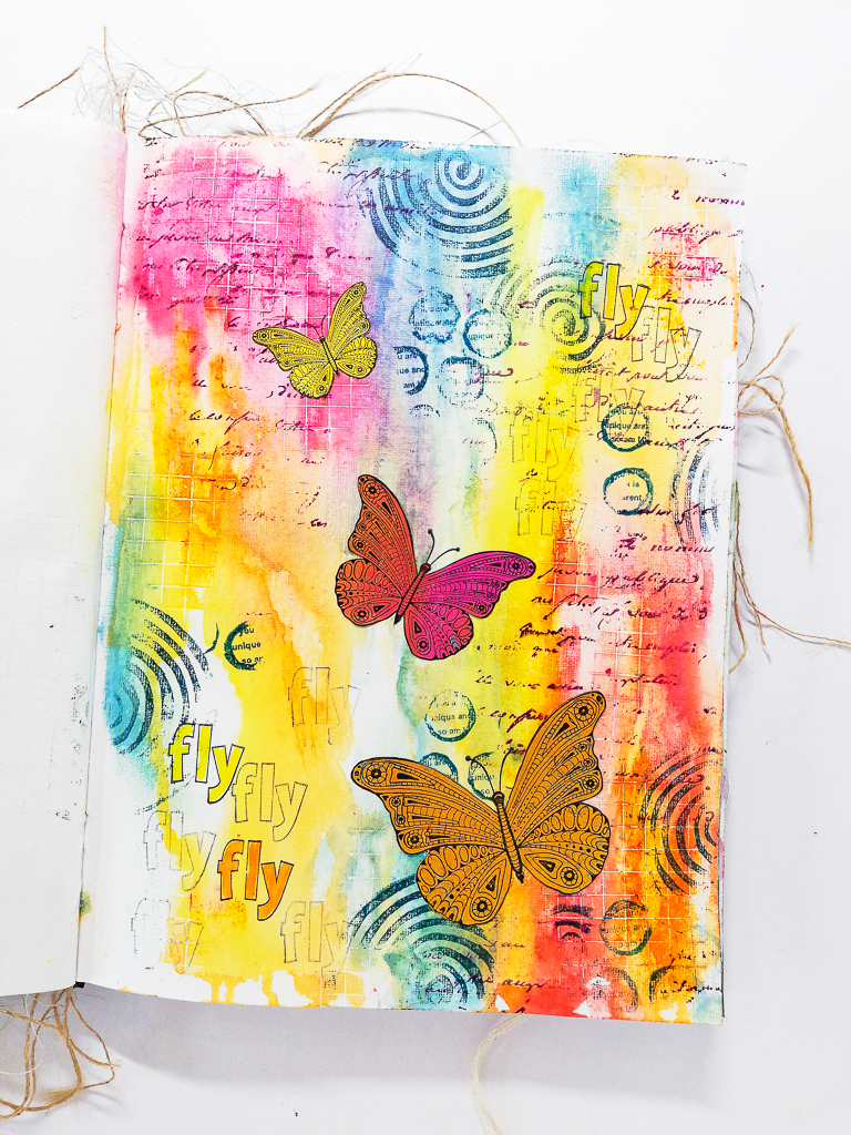 I’m creating a super easy art journal page today using Faber-Castell Gelatos together with some stamps in the Dina Wakley Media Journal. I’ve added transparent watercolor ground from Schmincke to the page first. The butterflies I’m using are from the Rubber Dance Butterfly Trio stamp set.