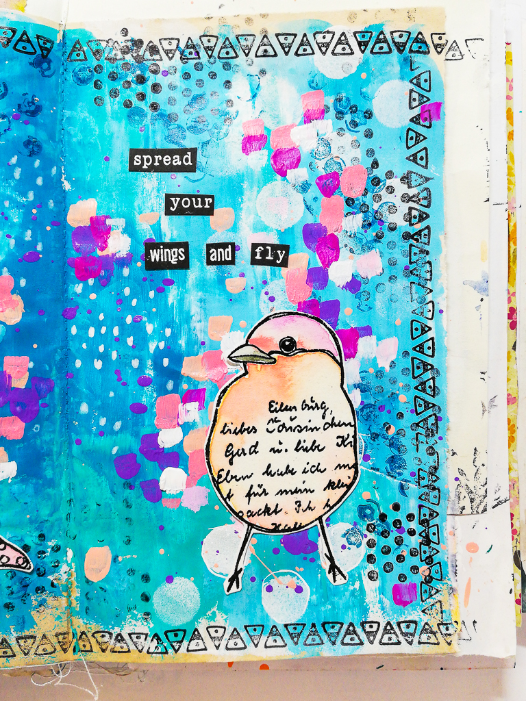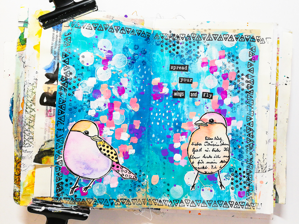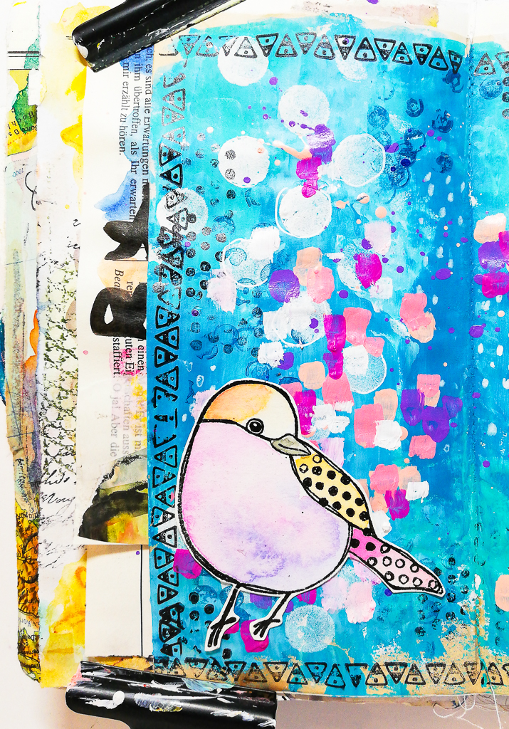 Today’s art journal page is created in my handmade junk art journal. I started with an acrylic background and used my Textured Bird stamps. For colouring I used the new White Nights pastel watercolors.