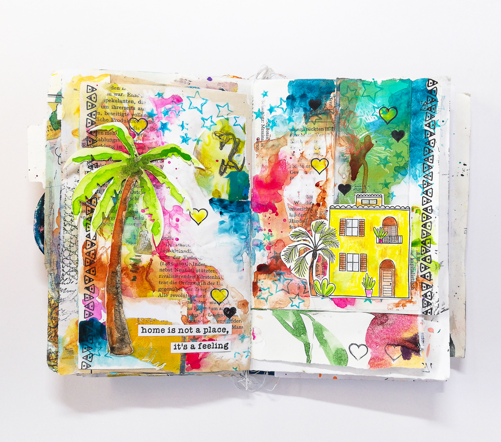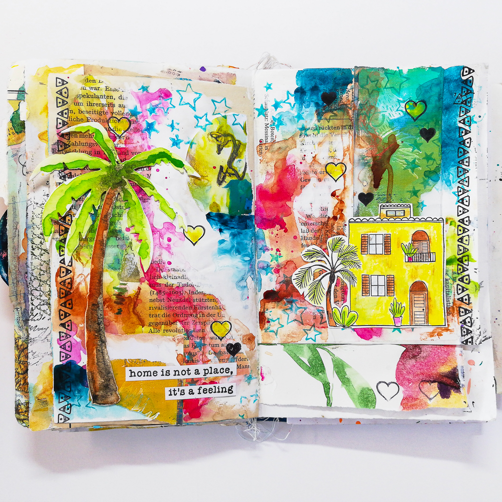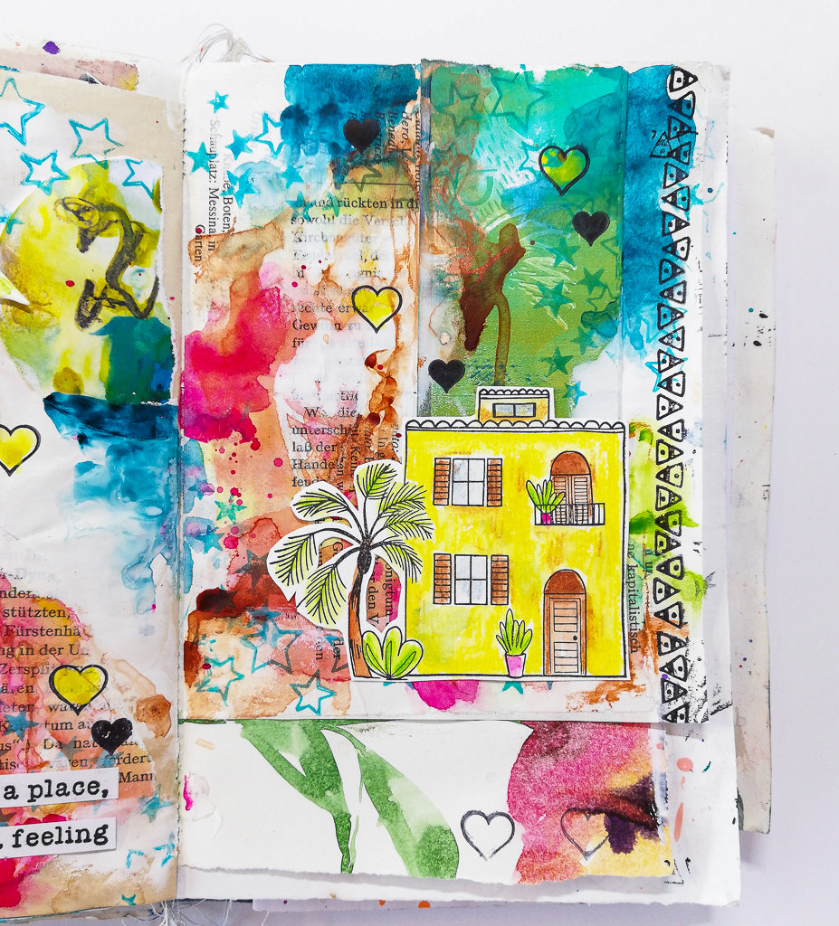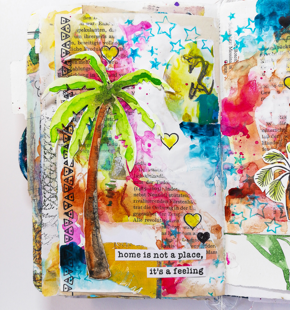 I’m playing in my messy handmade junk art journal today. I really enjoy painting intuitively. It’s all about the process and about focusing on that. Some people think art must be beautiful in the end! That’s not true! It’s all about the process and about enjoying it. I am working with my brand new stamps and create a holiday art journal page.