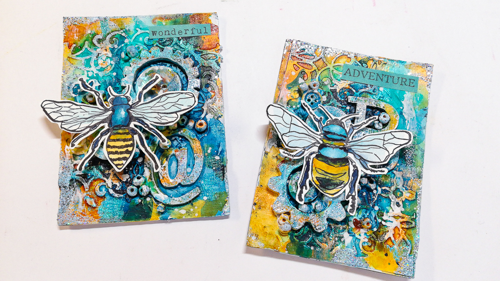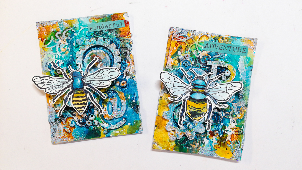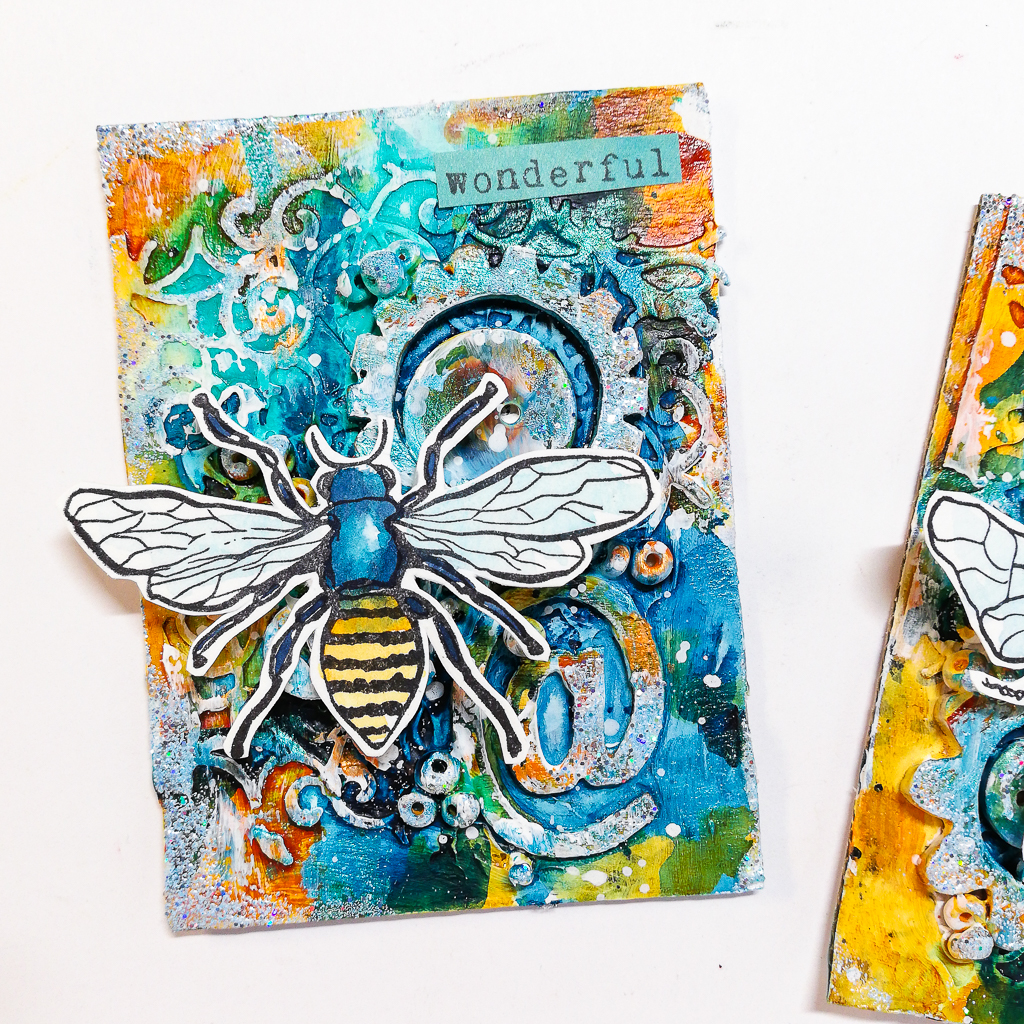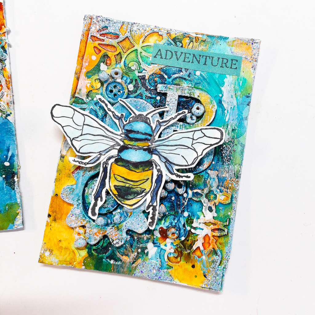 I’m sharing a artist trading card tutorial today using a lot of dimension on the background. I used embellishments to create a lot of texture and acrylic paints and inks to add color. My focal images are my brand new Bumbe & Bee stamps.