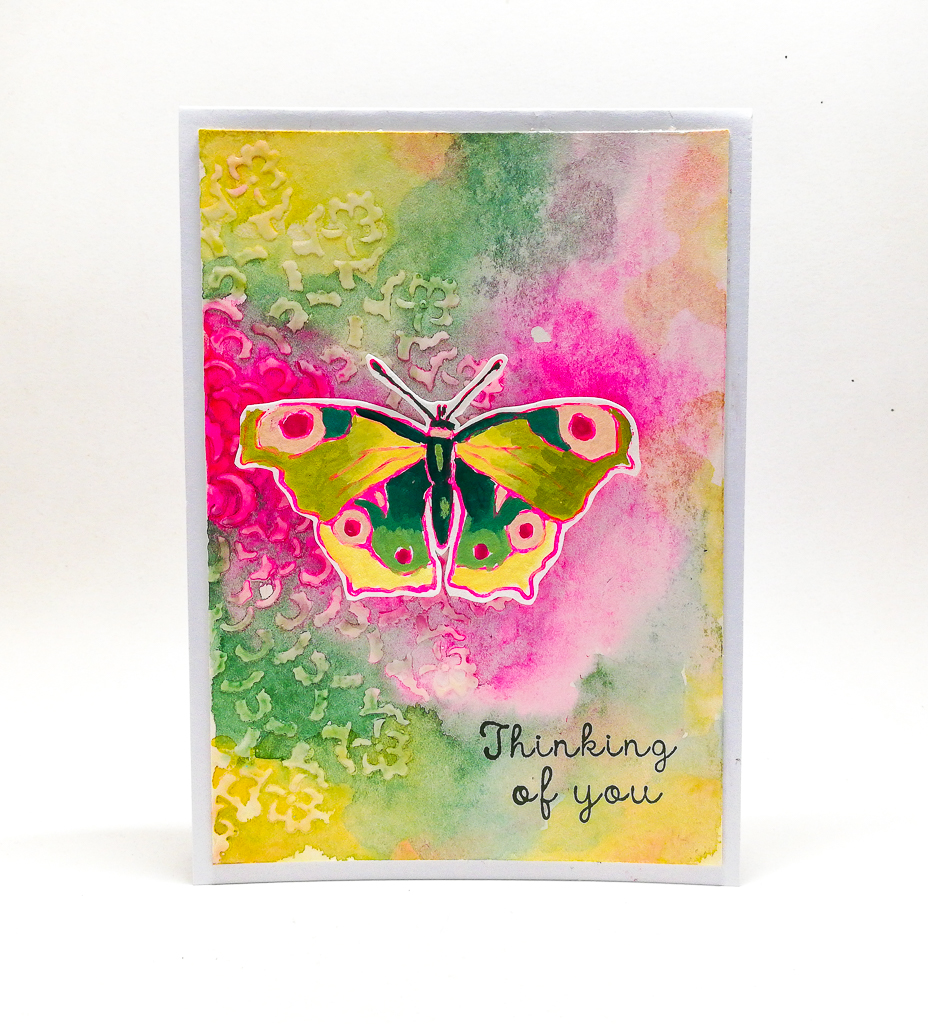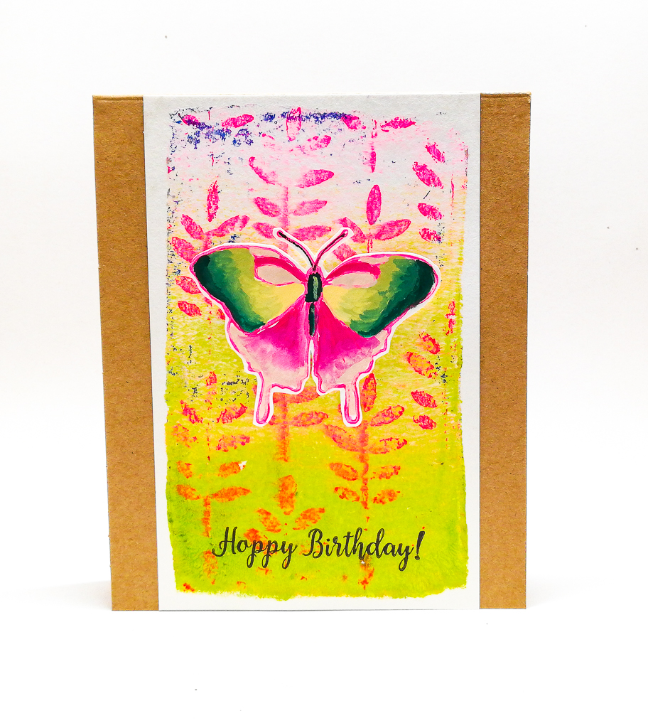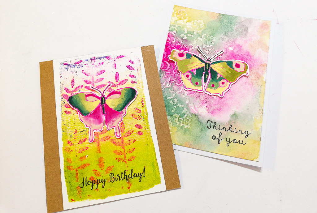 For the first card I used a watercolor background with a stenciled image. For the second I used a gelli print from my stash. The butterflies are stamped with neon pink acrylic paint and colored in with gouache paints.