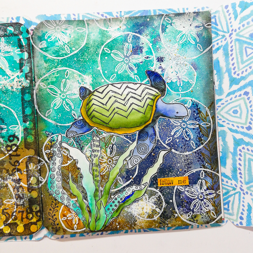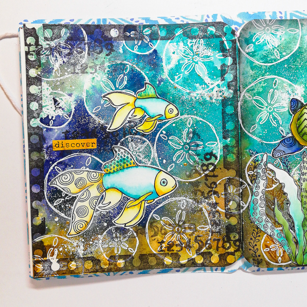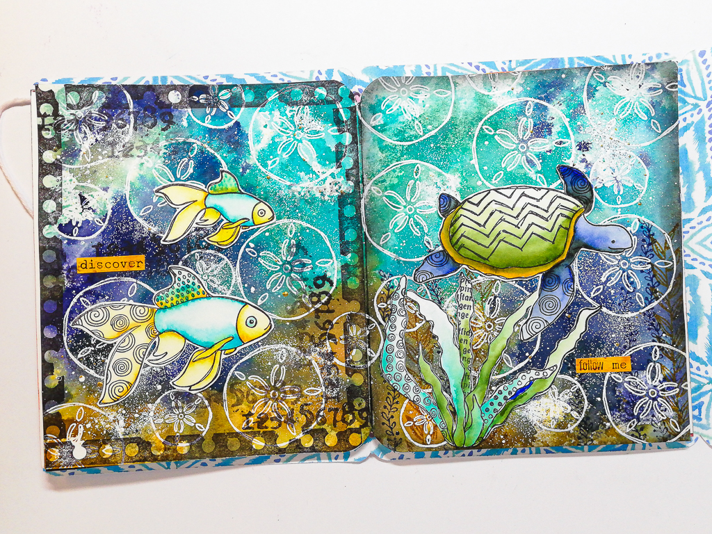 Today I am sharing a double spread using the embossing resist technique together with Distress Inks. I am using the Rubber Dance Textured Sea Creatures and Textured Fishes to embellish the page.