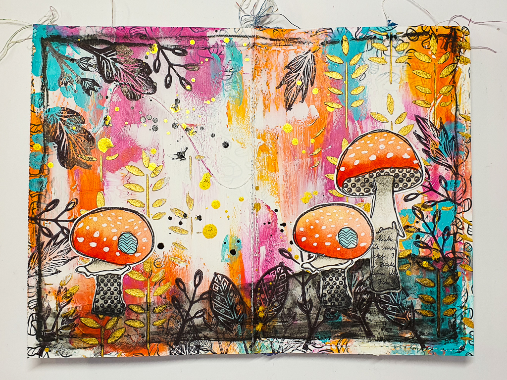 I’d like to share another easy way on how to make your own art journal. It’s a super cheap and easy Method. All you need is some paper and glue. A sewing machine is optional. I’m also creating an autumnal page in this journal using my Textured Mushroom stamps.
