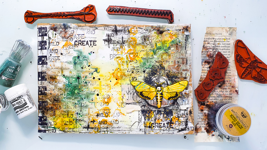Today I’m sharing another diy art journal. This time I used envelopes to make it.Of course I also create a page in that journal. I am using Brushos for it. I used a lot of different stamps on this page.