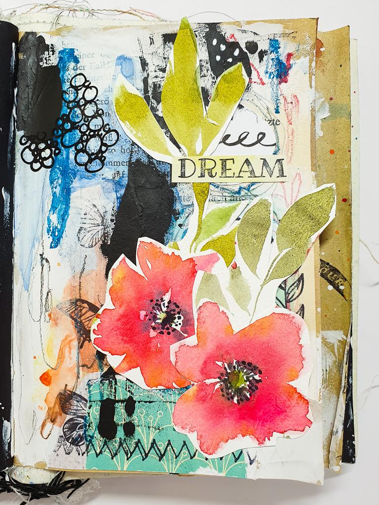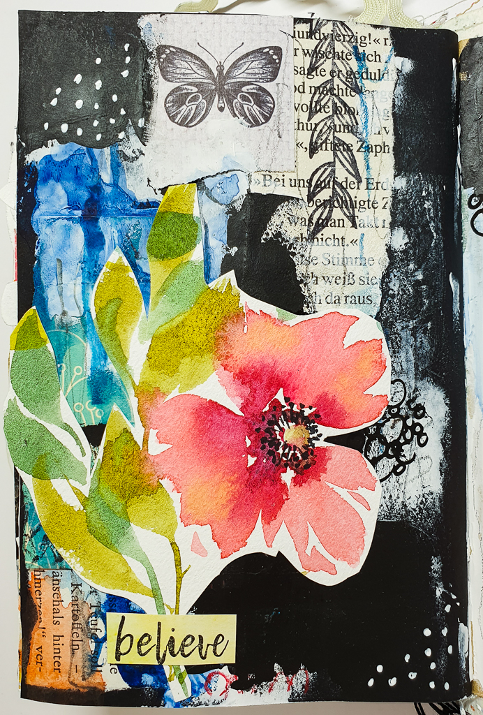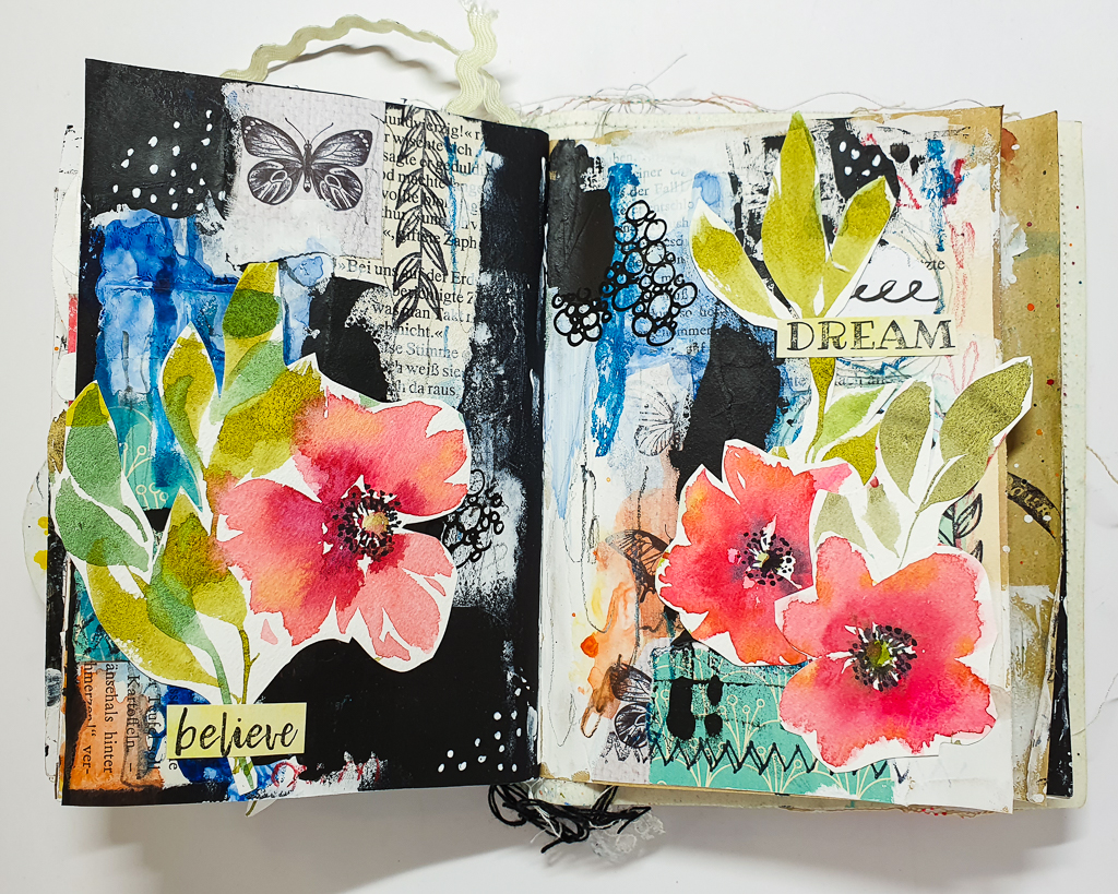 I have a junk art journal spread for you today using up some of my paper scraps and my loose watercolor flowers. I really love to create these spreads. They are perfect for a quick start when you don’t really know where to start.