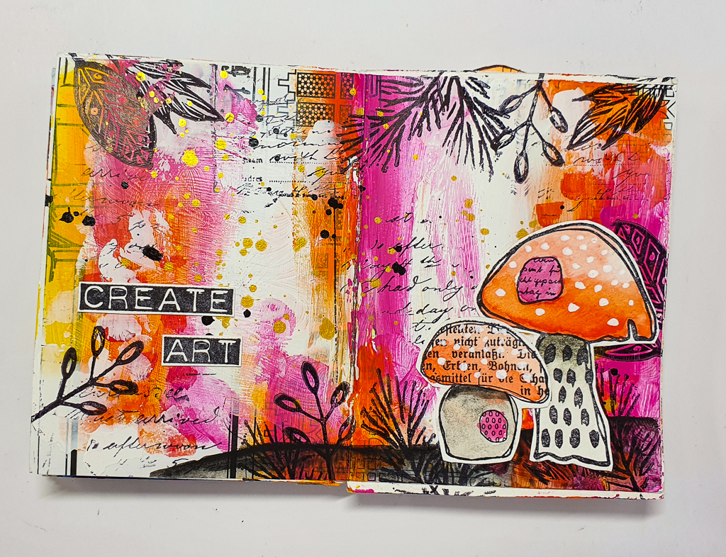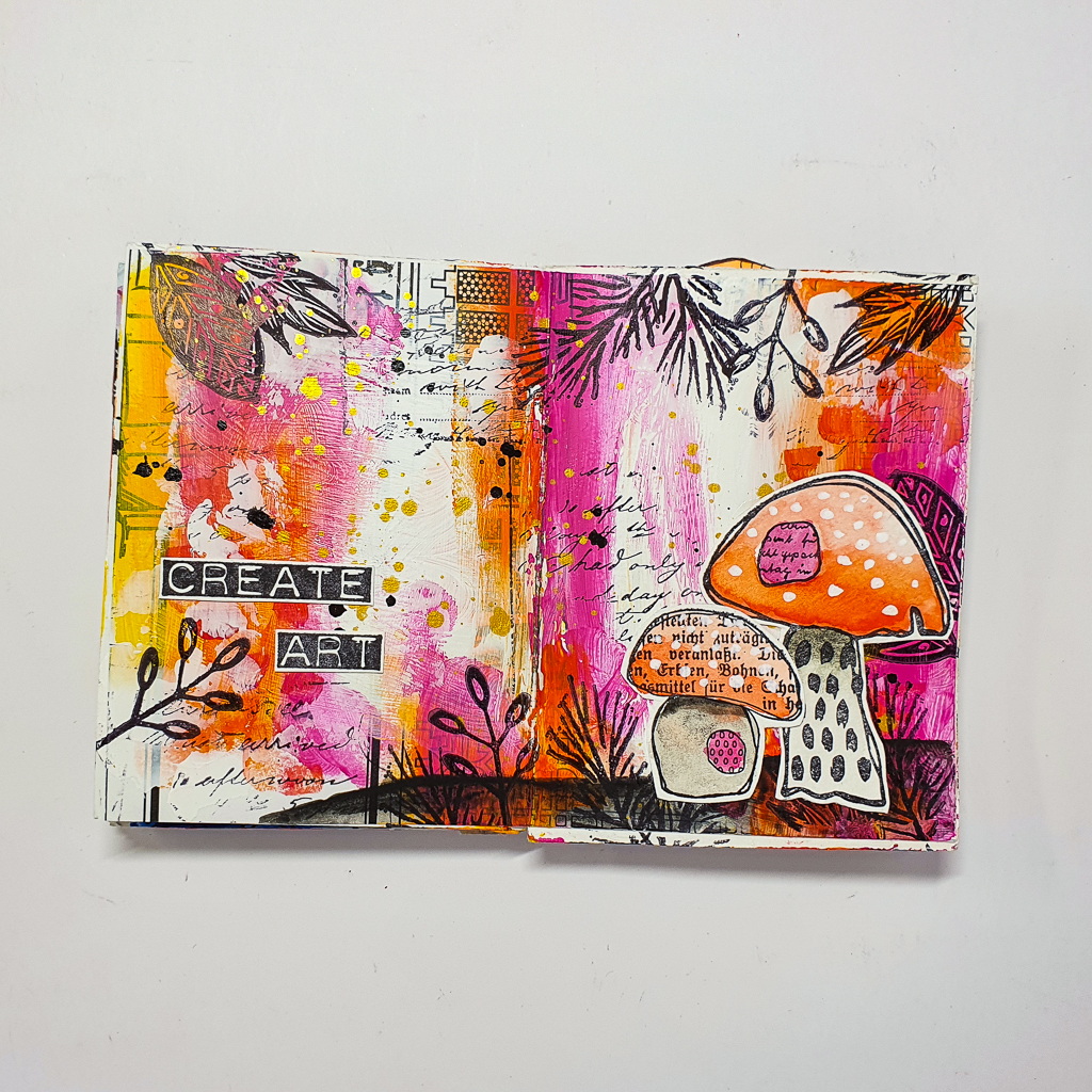 Today I’m making the last page of a mini journal that was laying around for about 3 years now (or even longer). It’s the same kind of back to back bound book I shared a view posts ago. For the page I used my Textured Mushroom stamps to create a fall mood.
