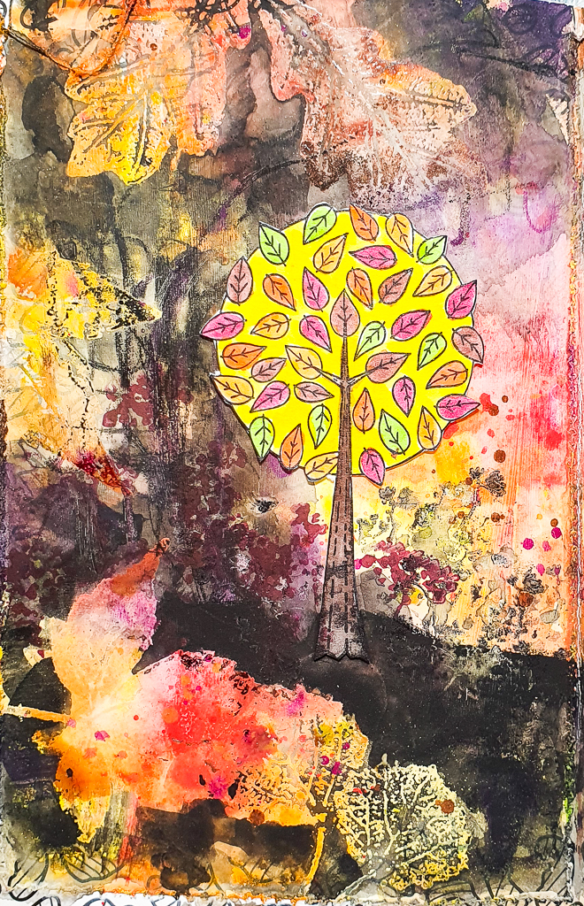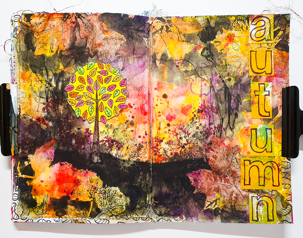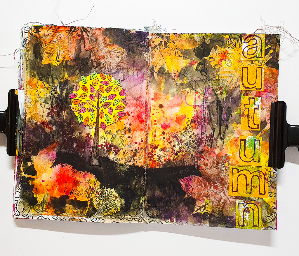 On this art journal page I used Stabilo Woodys together with an embossing resist technique. After I colored the background I embossed some stamp images with clear powder on top. The embossing acts as a resist.
