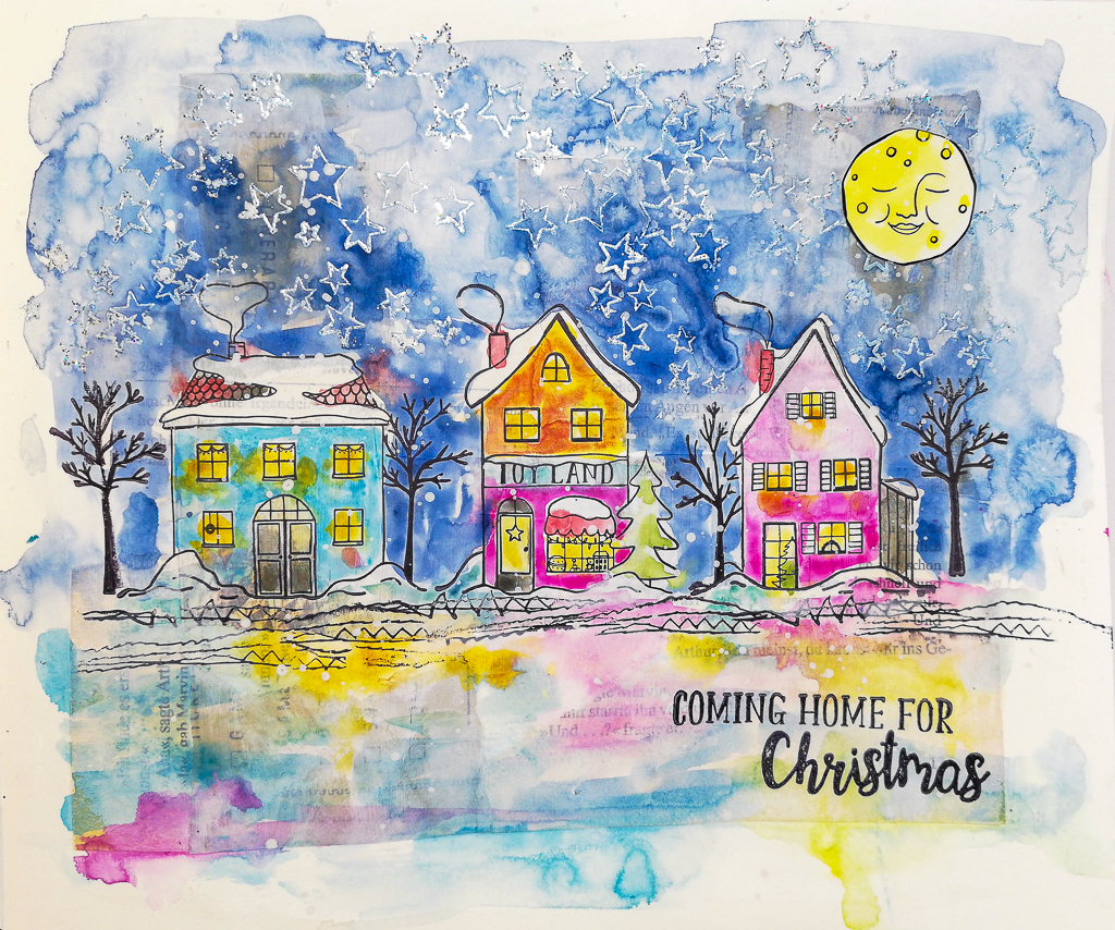 Today I am sharing a wintery Christmas scene with my Coming Home houses. I created a colorful scene on a collage background. I added color with the Neocolor II Crayons.
