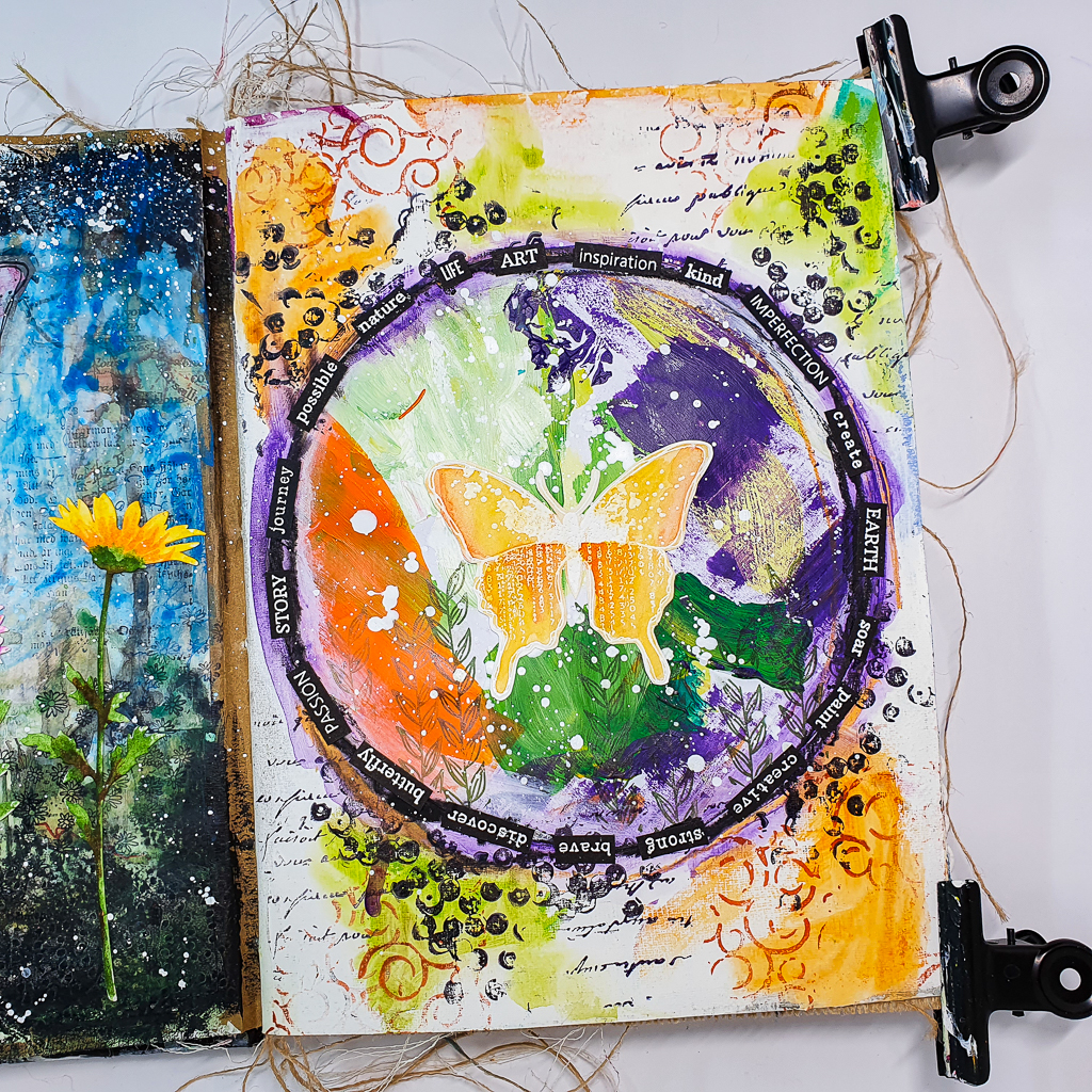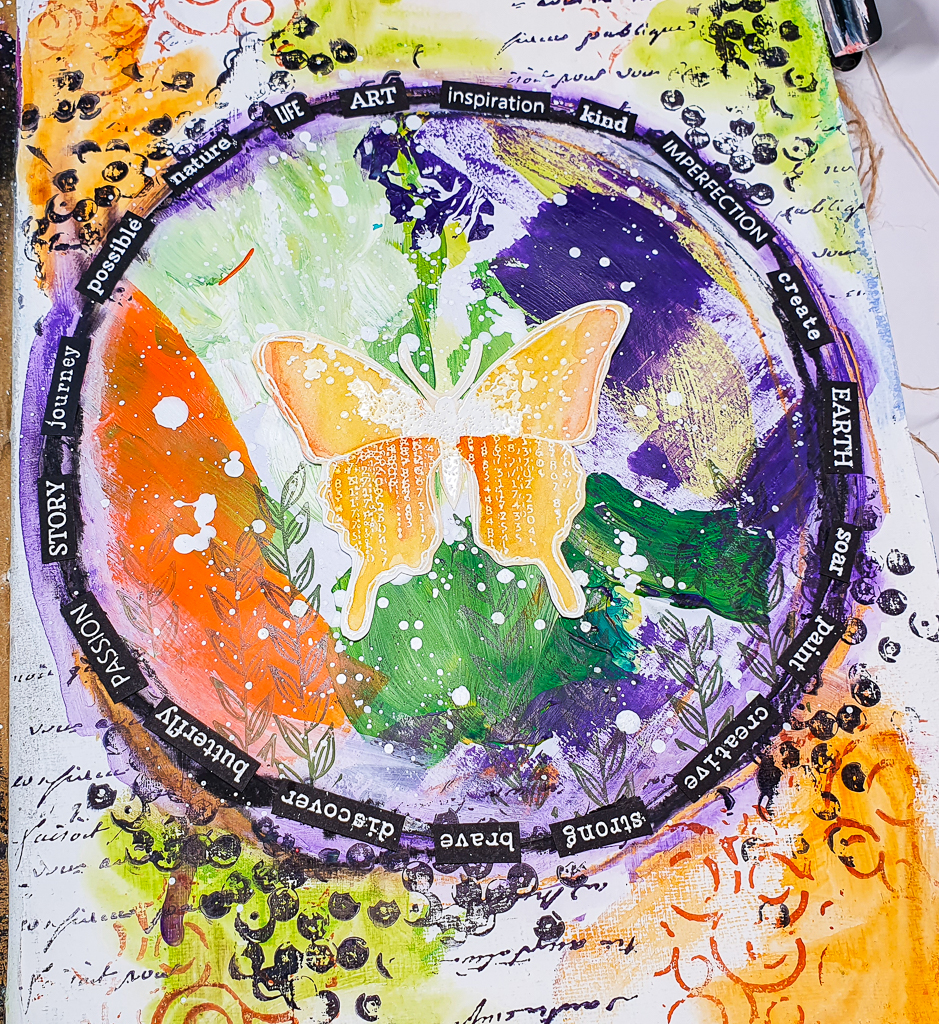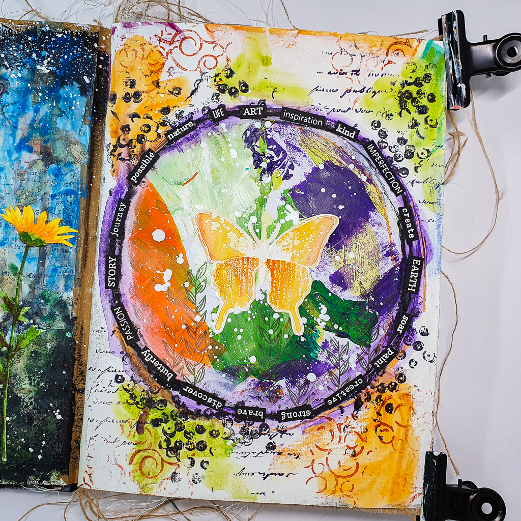 I’m back in my Dina Wakley Media Journal today. I am creating a collage with one of my messy underpapers and a lot of stamps. For more color I am playing with Stabilo Woodys.