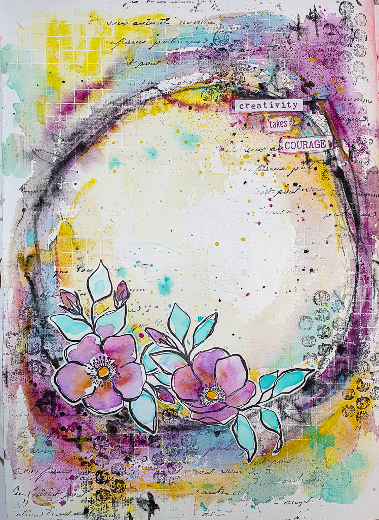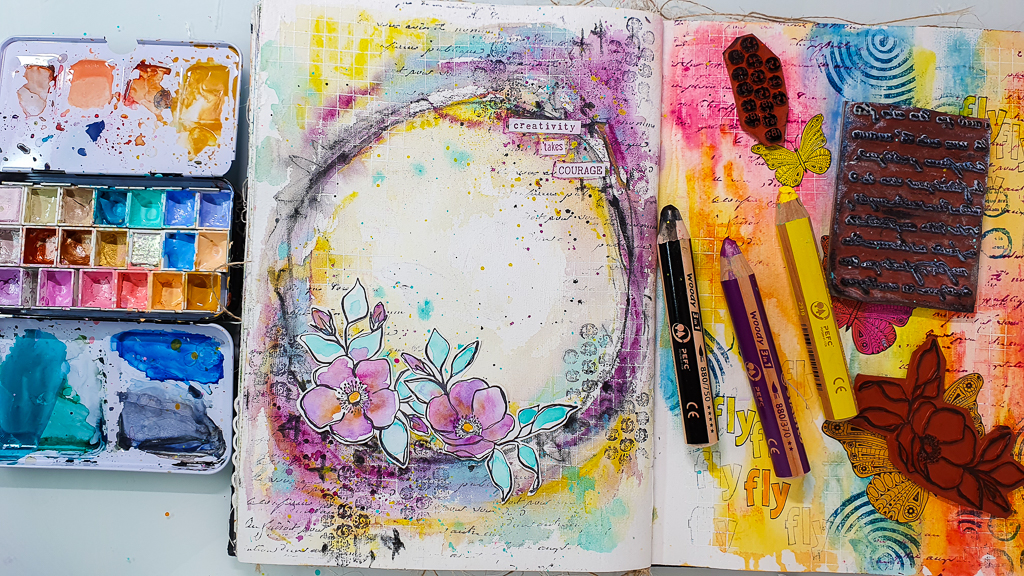 I’m back in my mini Traveler’s Art Journal today. I am creating a collage with old book paper and one of my messy underpapers. For more color I am playing with Stabilo Woodys and some stamps.