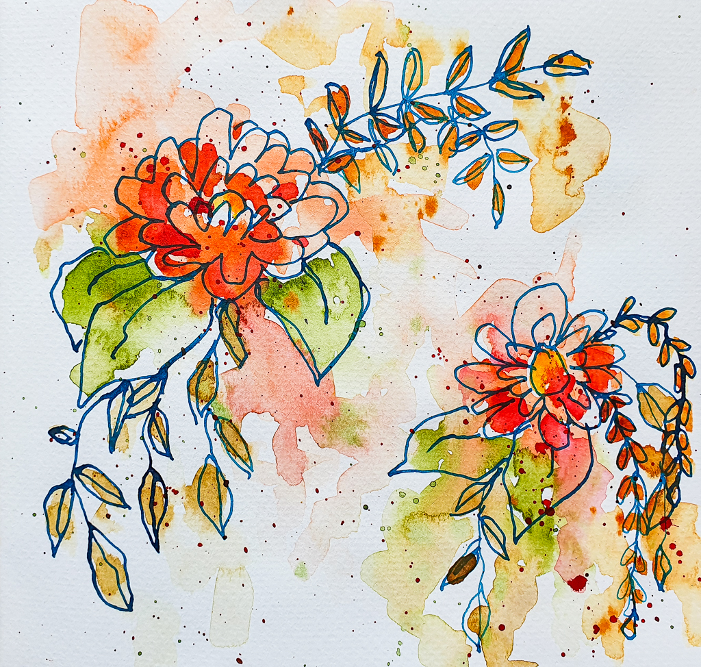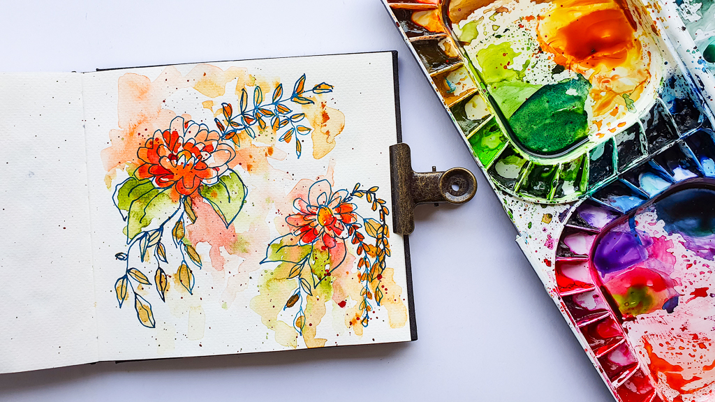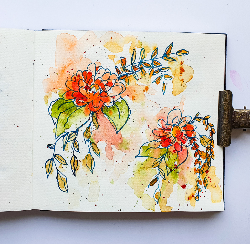 I love to paint loose and sketchy flowers with watercolors. I believe this is something everybody can do without having much knowledge about watercolor painting. For this spread I used waterproof ink to sketch the flower first and then I went in with my watercolors. I used Mijello Mission Gold watercolors as those are very transparent and I wanted to make sure not to cover up the ink lines. You can really easily fit this into a busy day. It’s a 5 min Sketch in the morning and 5min of coloring in the evening. Et voilá… it’s a pretty painting.
