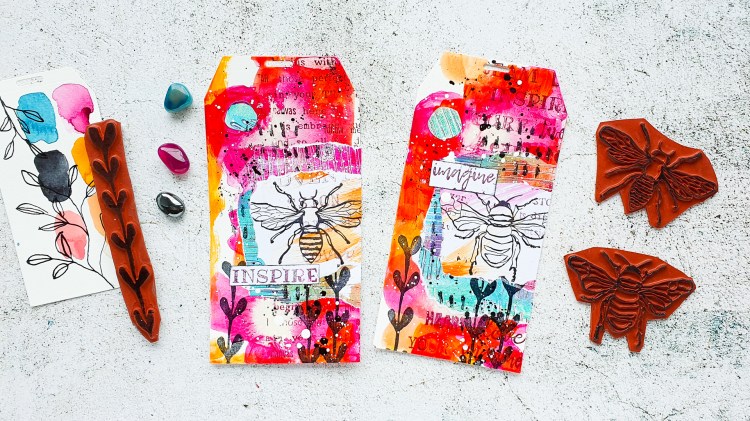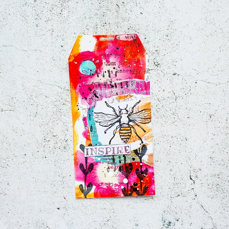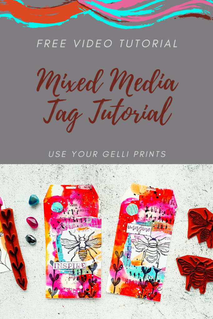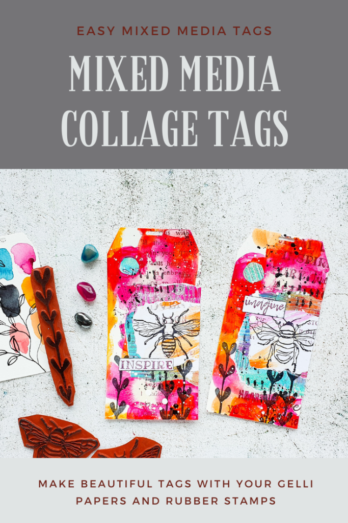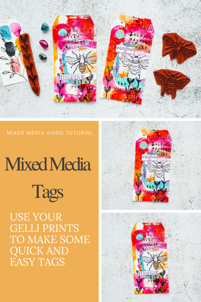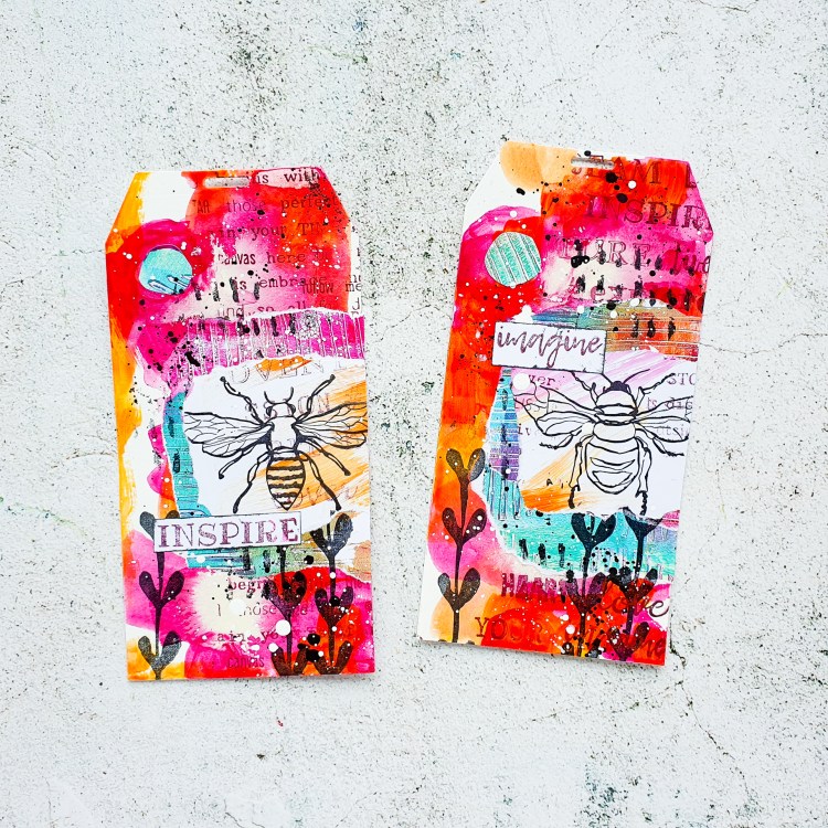 I’m creating some messy mixed media tags today using acrylic paints and ink for the background. I am adding some collage layers with gelli printed scraps and some stamping. I had a lot of fun making these!