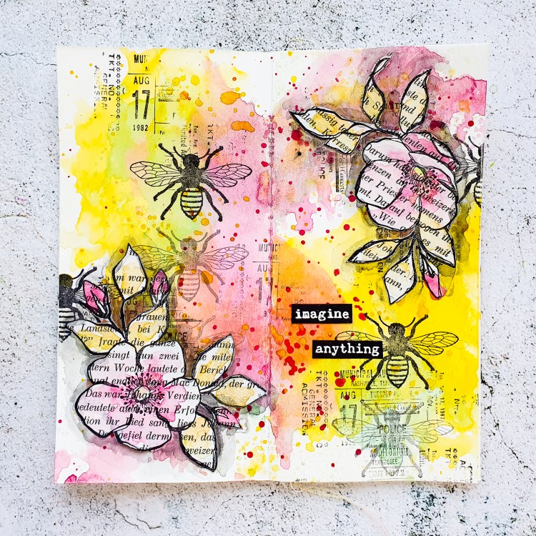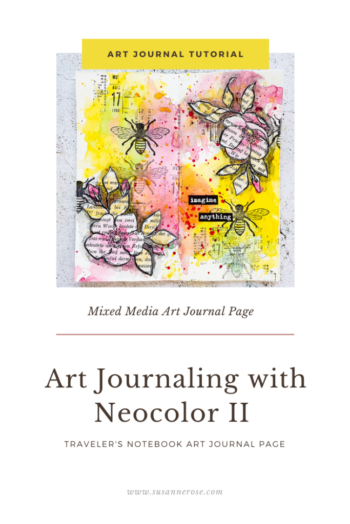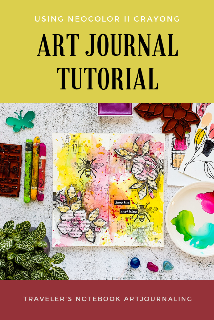 I’m creating a page today in my mini handmade Traveler’s Notebook Art Journal. I used the Neocolors for the whole spread. I created the background and colored in the stamped flowers. It’s an easy page an perfect for beginners.