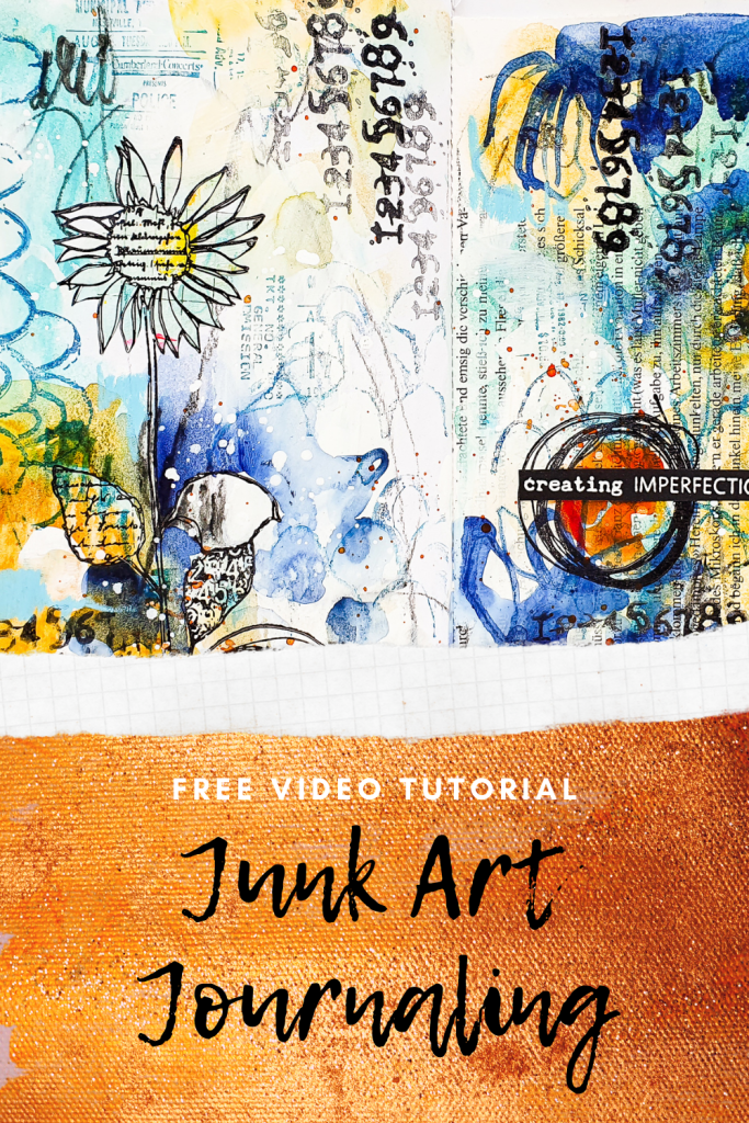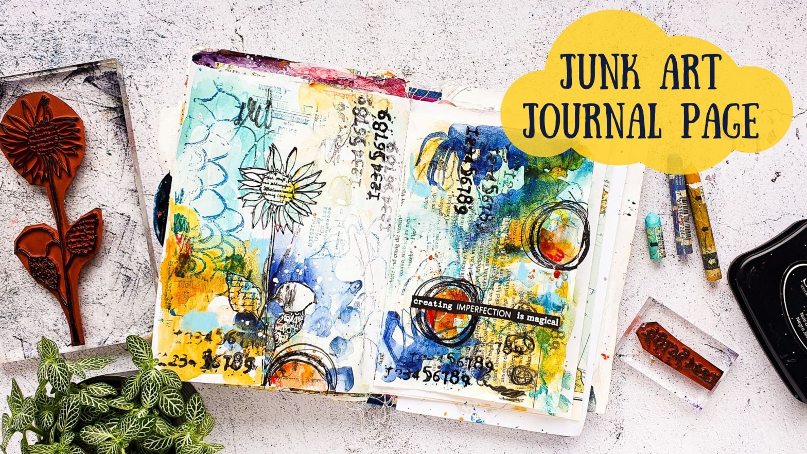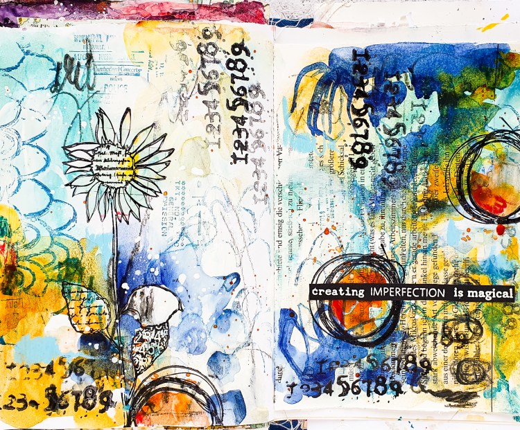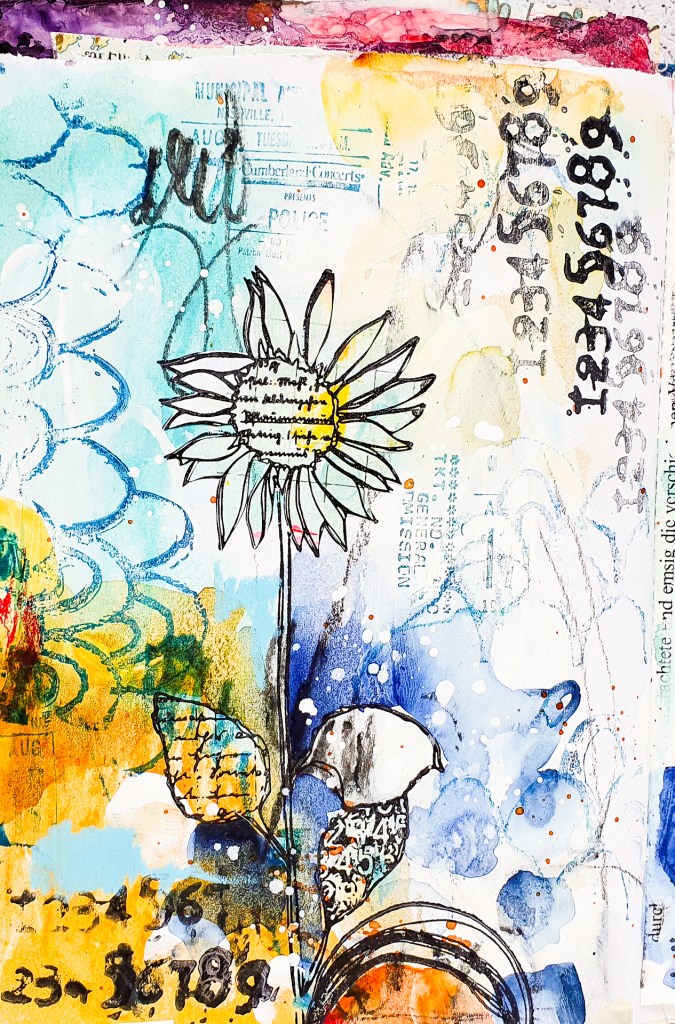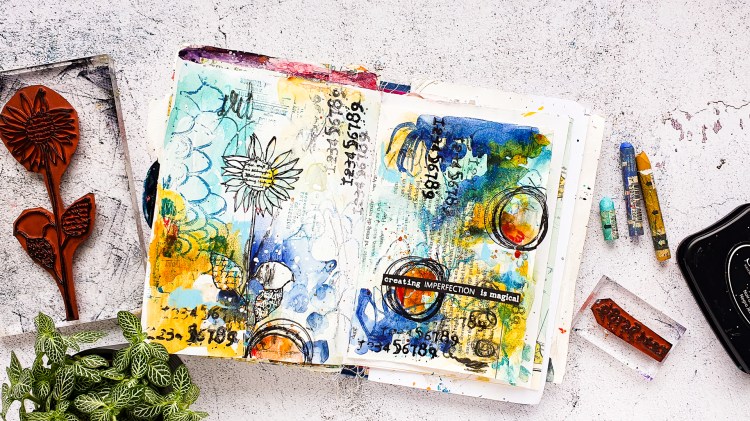 Welcome to a new mixed media tutorial. I’m playing in one of my handmade art journals today using mainly Neocolors II and watercolors. I create kind of a messy background. It’s really intuitive and easy. My main image is one of my new wildflower stamps. I used it together with the Mixed Media Marks and Pencil Marks stamp set.