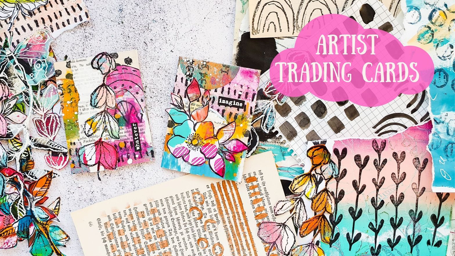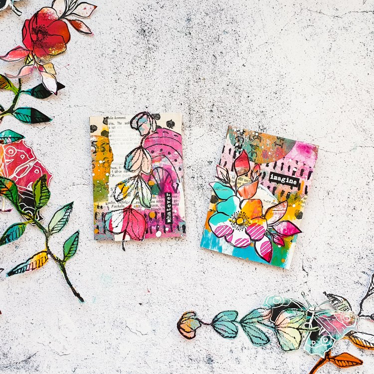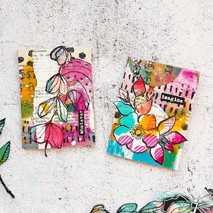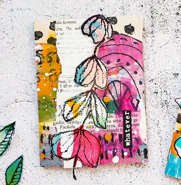 In Today I am creating a bunch of collage papers from Gelli Prints, Paper Scraps, Old book pages, Palette papers and also some “Collage-Snacks” as focal images for mixed media projects. With this stuff I create some mixed media Artist Trading Cards.