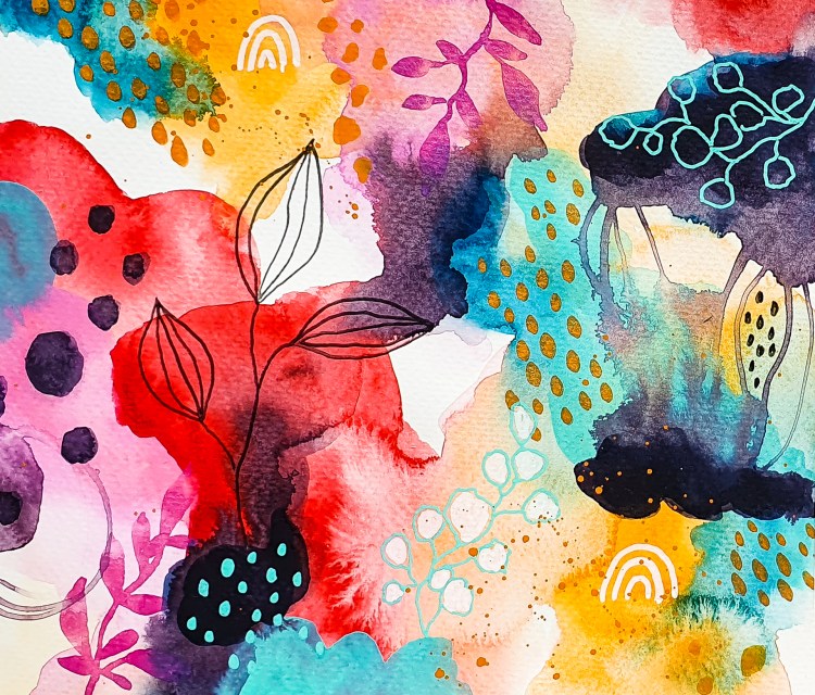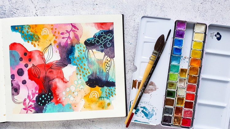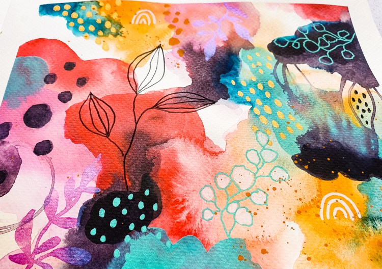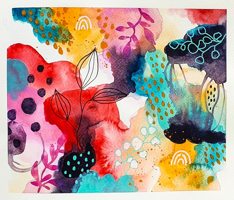 Today I am painting another abstract watercolor spread in my Art Journal. I enjoy playing intuitively very much. I am using normal watercolors and also some metallic ones for accents and also the uniPosca paint pens.