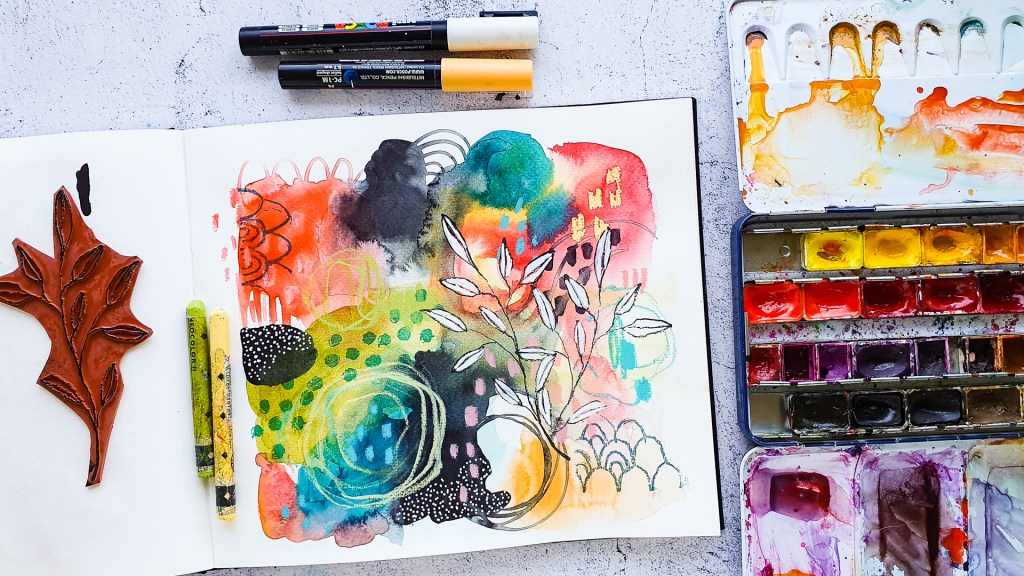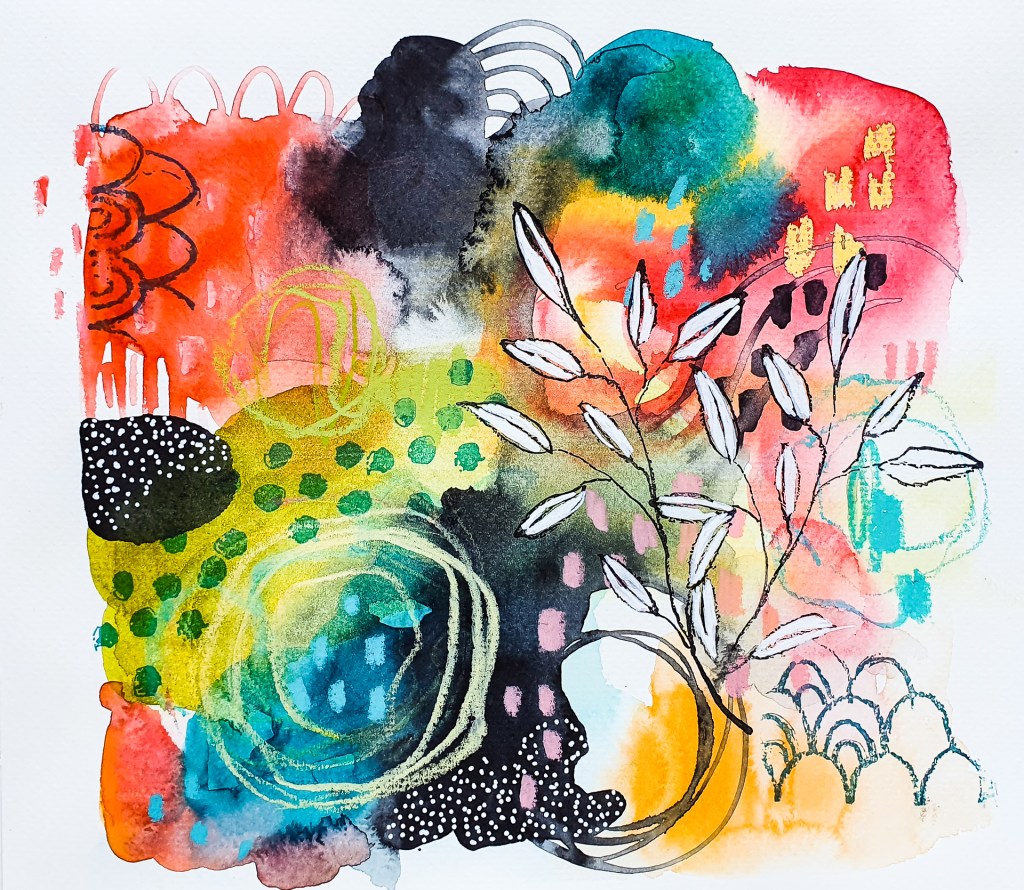I use mainly watercolors for this art journal spread and some of my handmade collage papers. This collage fodder is perfect when you don’t have much time to create.