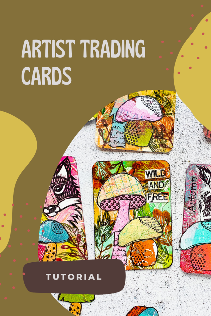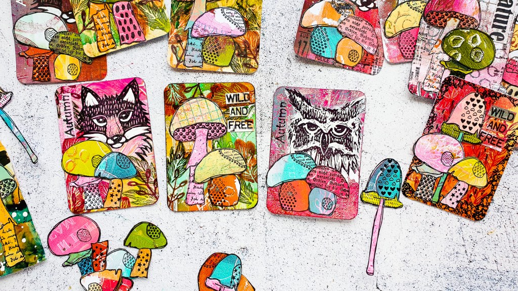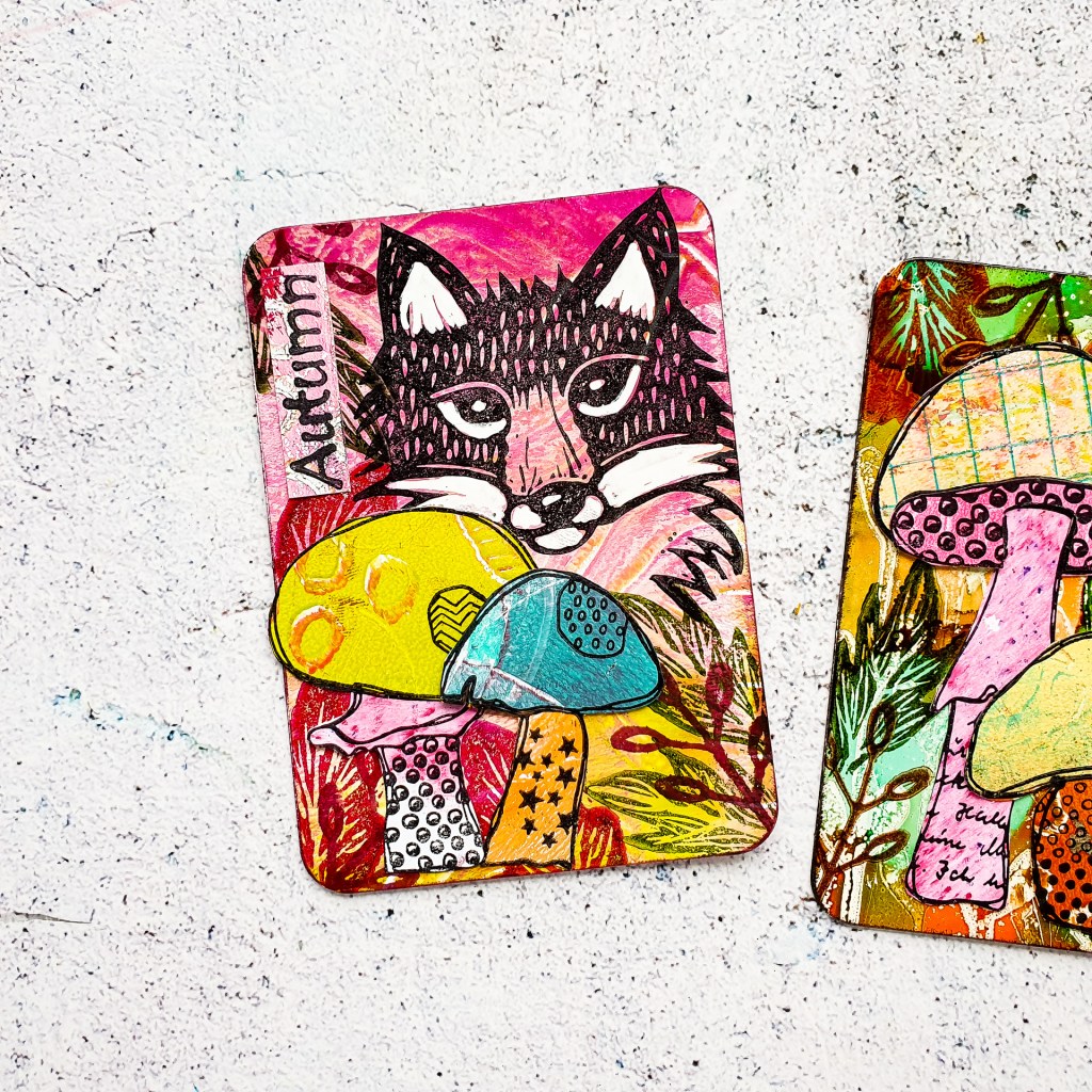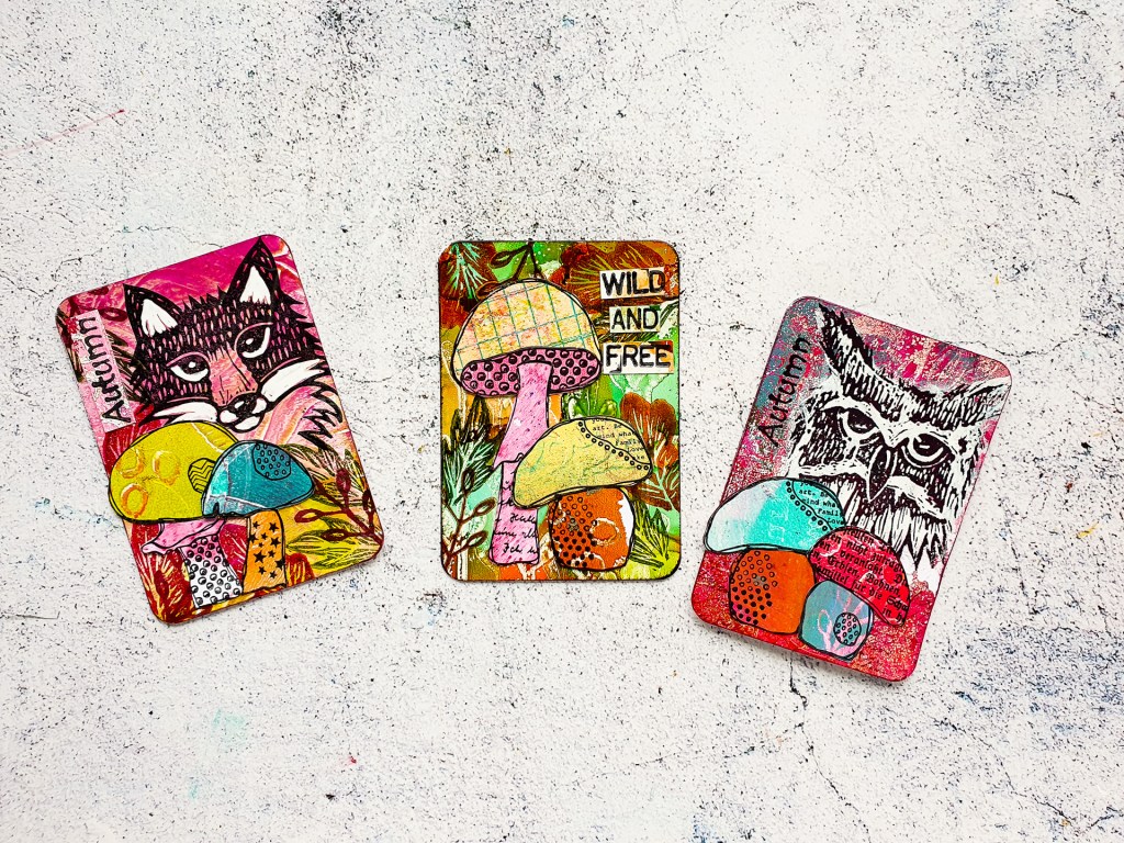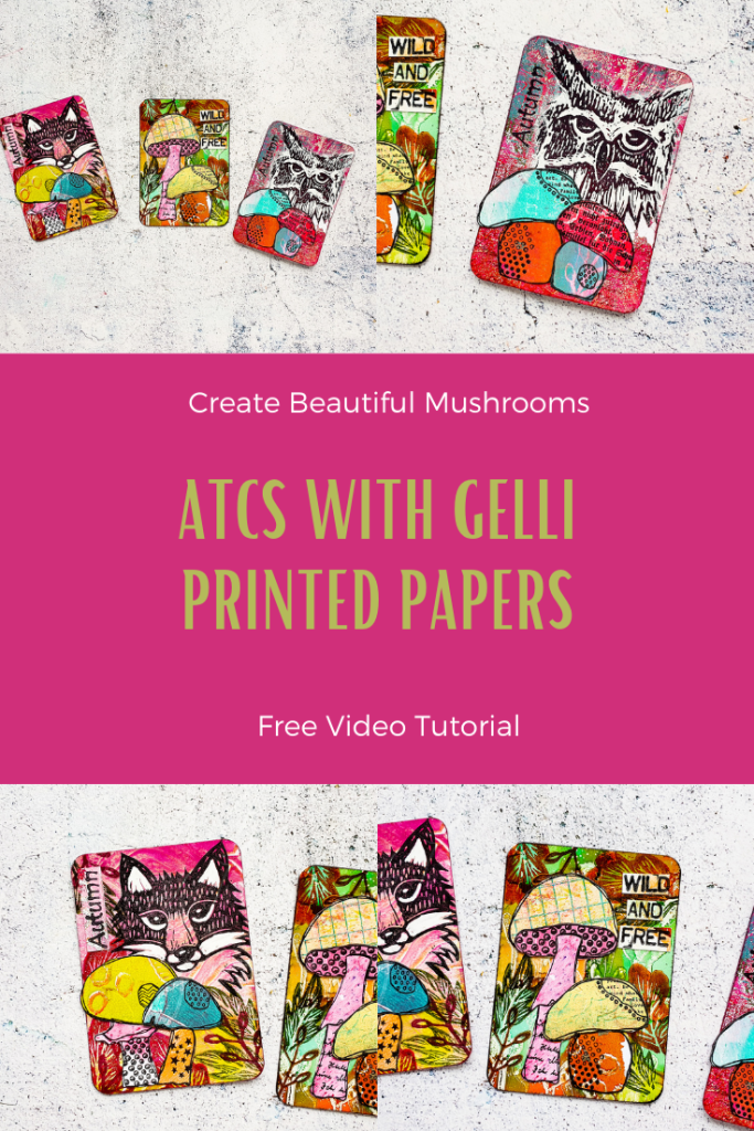 I made a bunch of autumnal Artist Trading Cards using up a lot of my Gelli Print Scraps. For these cards I used my favourite autumn stamp sets. The Carved Whimsy Wood and Textured Mushrooms! All stamps are linked at the end of the post.