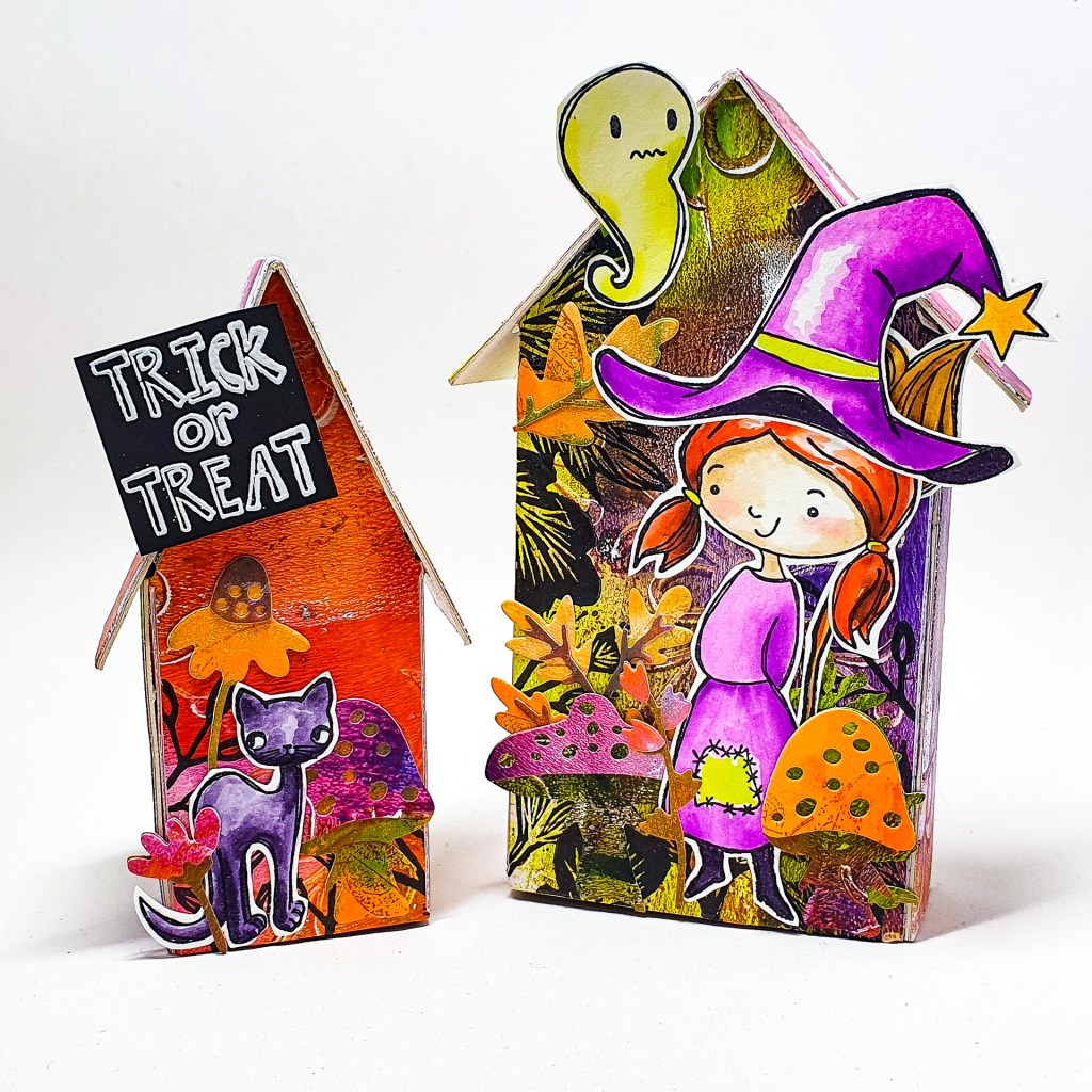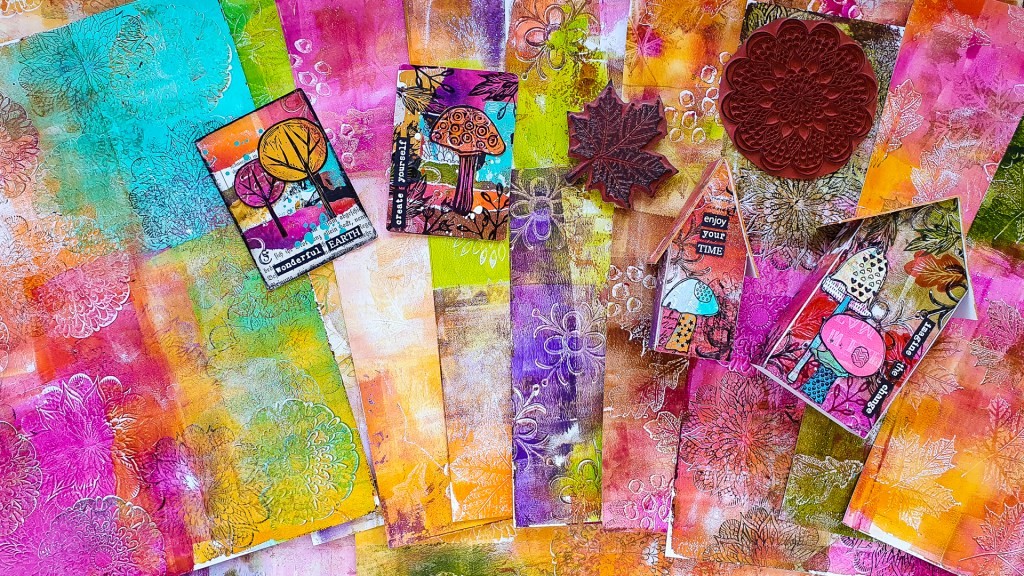 In today’s video I am making some autumn themed gelli prints. They are great for all Autumn or Halloween paper projects. I am creating the prints with different stamps. You will find them linked up at the end of this post. I have already made some creations with the prints. You will find them also when you scroll down.