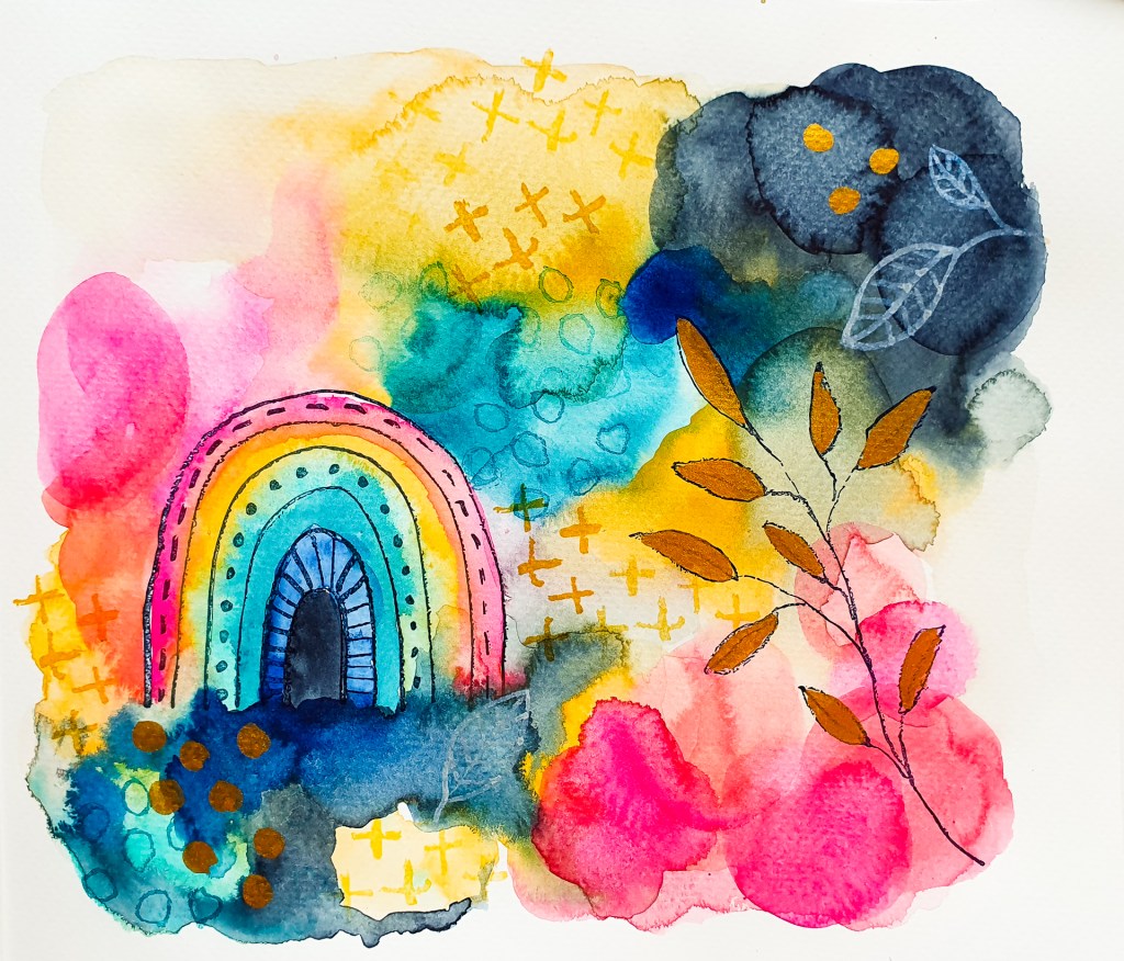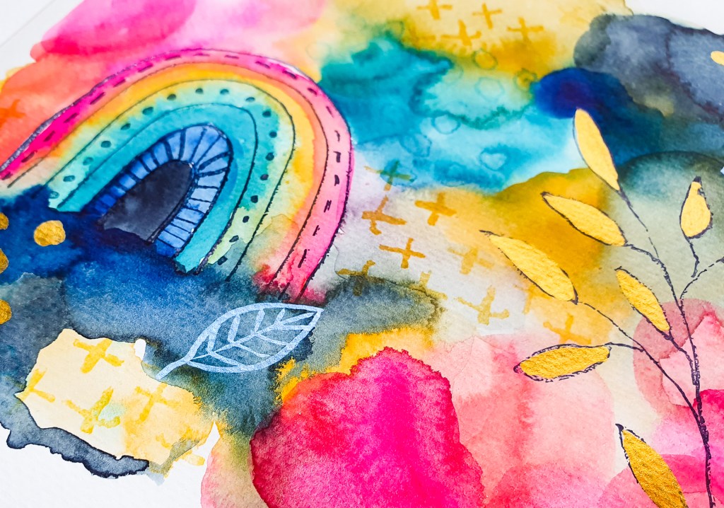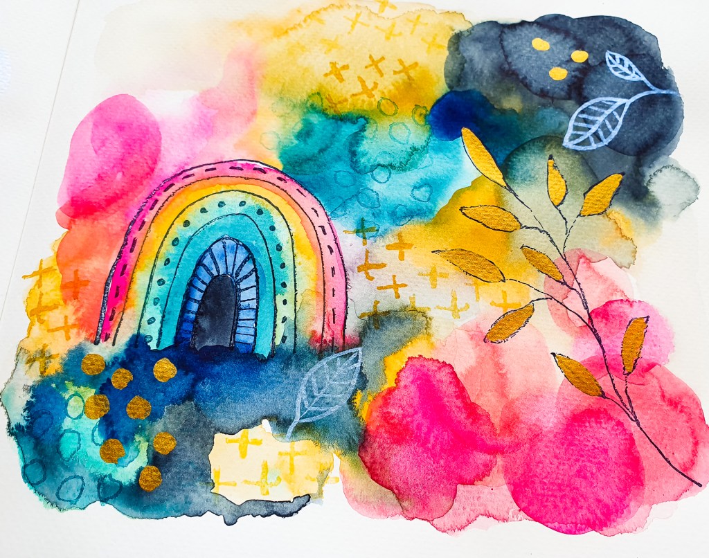 Painting abstract with watercolors is super relaxing and so much fun. On this spread I used also metallic watercolors and some of my stamps.