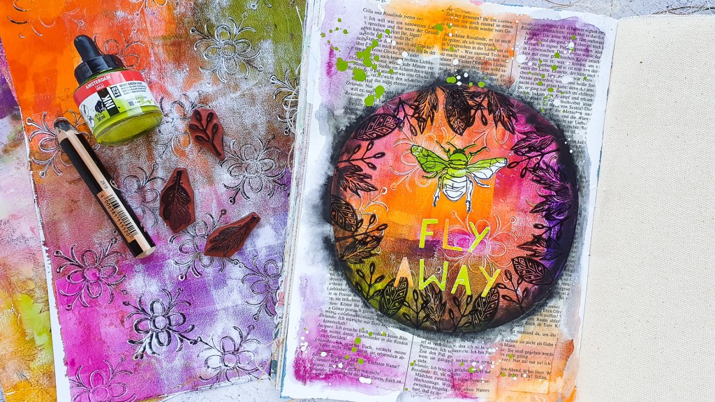 I’m playing in the Dina Wakley Media Journal today using one of my autumnal gelli prints, I’ve shared a while ago. I am also working with some old book paper, stamps and Stabilo Woodys. These are great for mixed media.