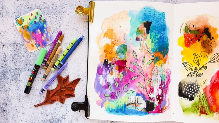 For today’s abstract art journal page I am working mostly with Neocolor II crayons. I asked you guys over on my Instagram stories to pick a color scheme and this is what I am going to use today. I am also using some collage elements and some stamps. I also use the Neocolors for stamping.