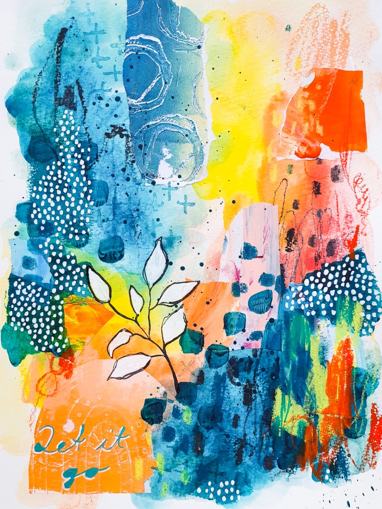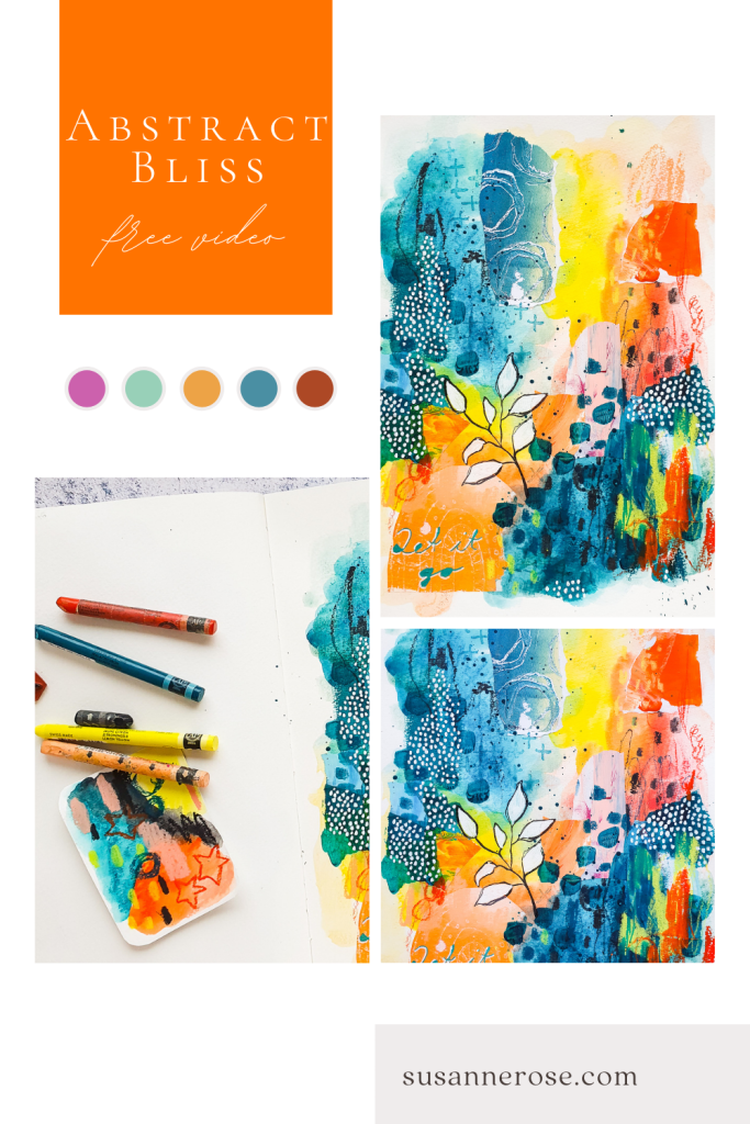For today’s abstract art journal page I am working mostly with Derwent Inktense Blocks. I asked you guys over on my Instagram stories to pick a color scheme and this is what I am going to use today. I am also using Neocolor II Crayons, some collage elements and some stamps.
