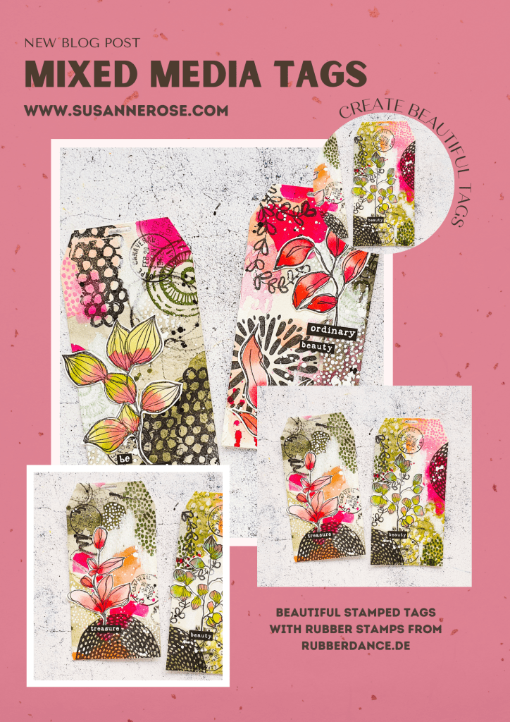 I’d like to share some mixed media tags that I’ve made with a lot of my new stamp designs. I created a big masterpiece from watercolor paper and cut it into tags. In the next step I added texture and shapes with stamps from the Mixed Media Marks, Carved Collections and Pencil Marks. The focal images are leaves from the Sketchy Leaves stamps set.