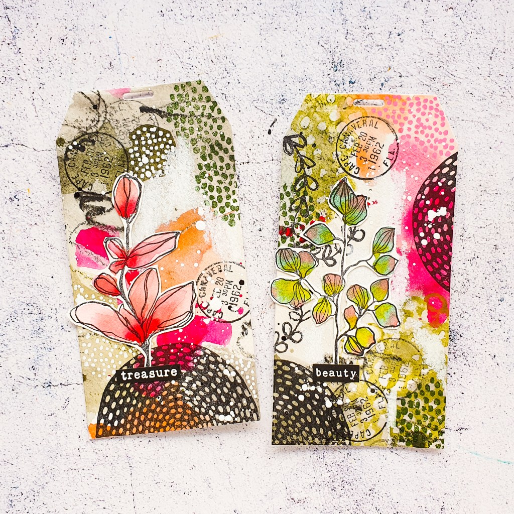 Heute möchte ich euch einige gestempelte Mixed Media Tags zeigen. Verwendet habe ich dafür ein großes Blattpapier, welches ich mit Aquarellfarben und -stiften bemalt habe. Aus diesem wurden die Tags gestanzt. Diese habe ich dann ganz fleißig in mehreren Layern bestempelt. Als Hauptmotiv kamen die Blätter aus meinem Sketchy Leaves Stempelset zum Einsatz.