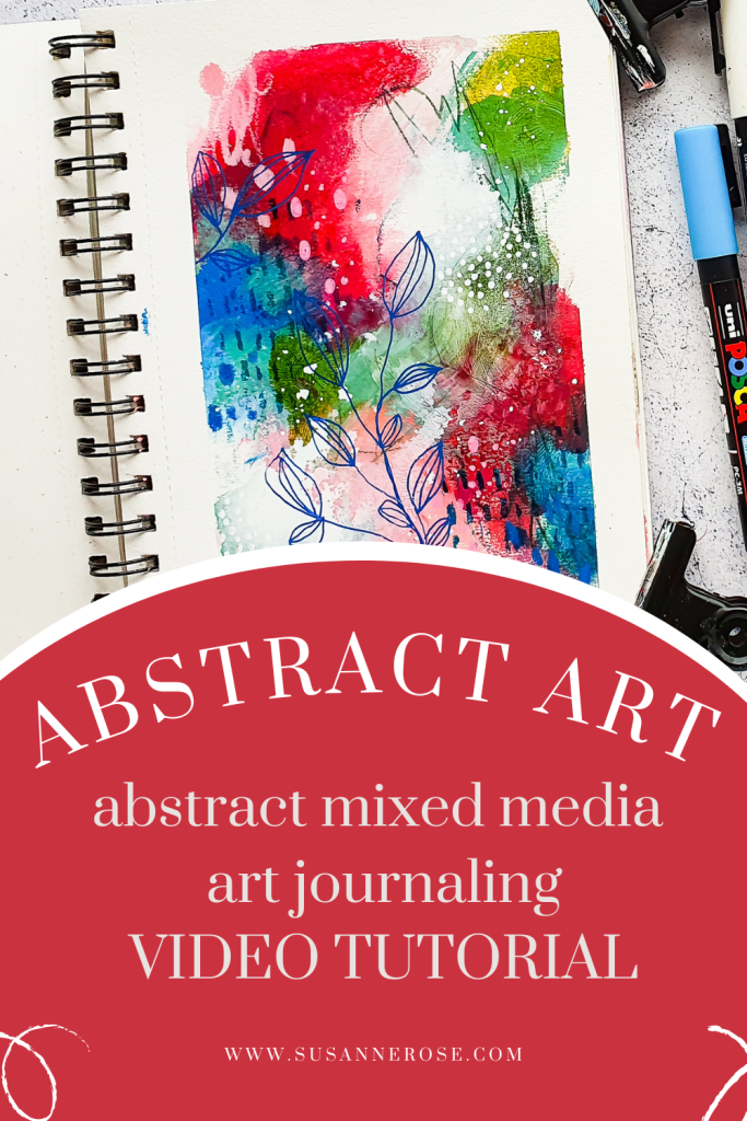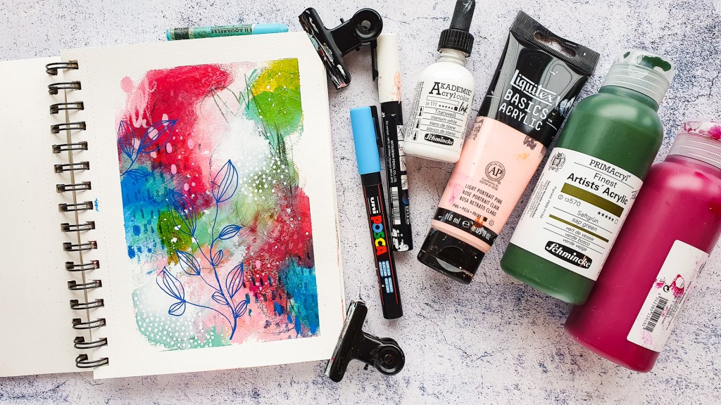 Today I’m sharing an abstract art video tutorial. I love to create abstract mixed media pages in my journals. As they usually have some drying times inbetween I used to work in more journals at the same time. For this page I used mainly Acrlyics, Neocolor II Crayons and a watercolor pencil. To create more texture and markmakings I used a stamp from the Pencil Marks 2 set, pastel pencil and Posca paint markers.