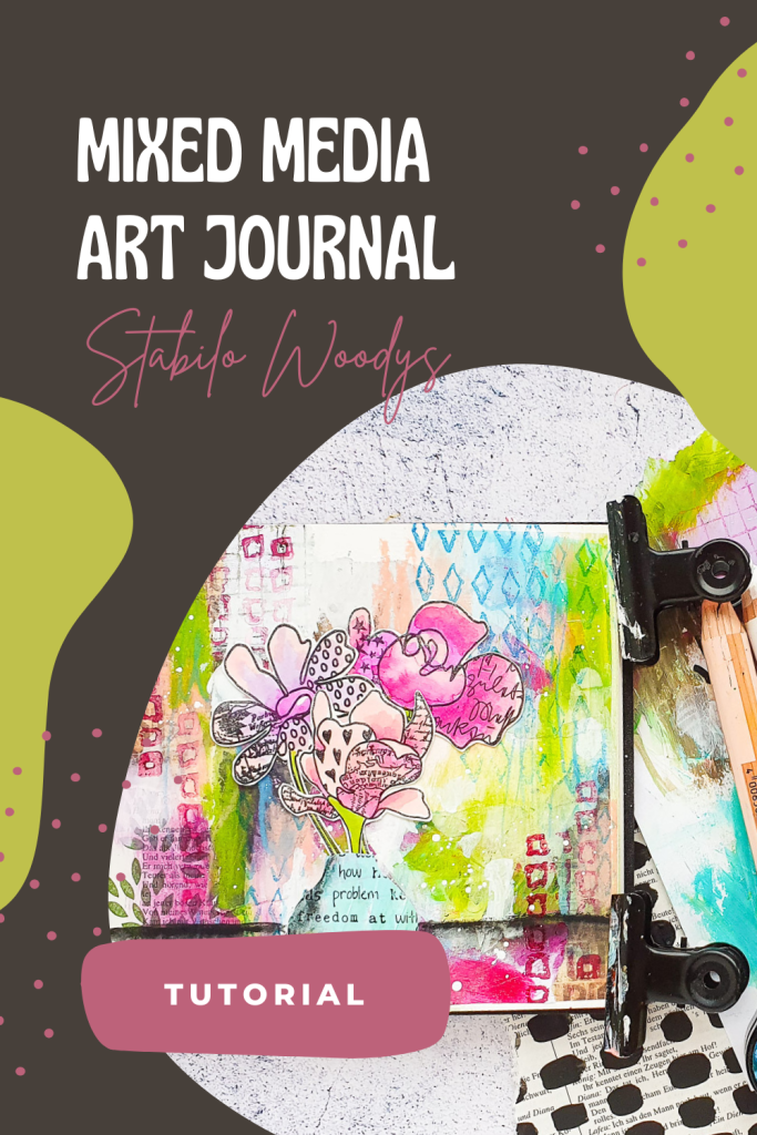 I’d like to share a mixed media art journal page that I’ve made with the brand new clearstamps from Rubber Dance. We decided to add clearstamps to our range, as we are running into a capacity limit with our rubber production. With only two of us we just can’t press as many stamps as we need. A second reason is, that the rubber has become super expensive during the last two years and we have to increase the price soon. We are starting with 9 clear sets. They all come in the size of A5 and they all have a few more stamps compared to their rubber version. The clear sets are made in the UK and are super high grade photopolymer, crystal clear with sticky back! I already love them! On today’s spread I am starting with a collage background and adding Stabilo Woodys on top.