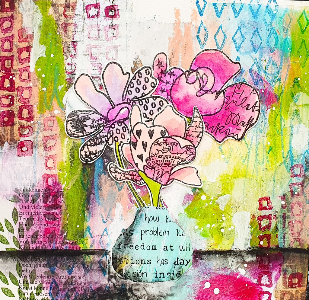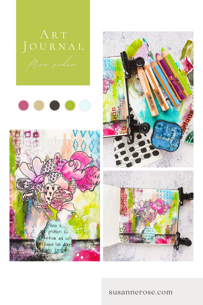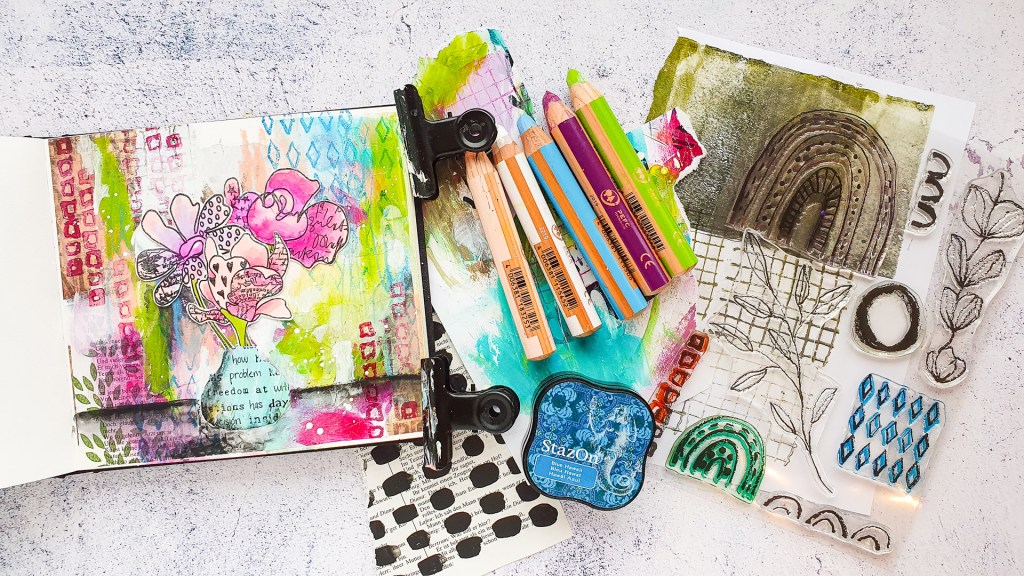 Heute möchte ich euch eine mixed media Art Journal Seite mit meinen neuen Klarsichtstempeln von Rubber Dance zeigen! Wir haben uns entschieden Klarsichtstempel in unser Sortiment aufzunehmen, da wir zunehmend an zeitliche Kapazitätsgrenzen stoßen. Ein weiterer Grund ist, dass der Gummi (den wir aus den USA importieren müssen) während der letzten zwei Jahre um ein vielfaches teurer geworden ist. Was bedeutet, das wir den günstigen Preis nicht halten können. Wir starten mit neun Klarsichtsets. Sie haben die Größe A5 und somit etwas mehr Platz für 1-4 extra Motive im vergleich zu den gleichnamigen Gummiplatten. Die Clearstamps werden in England hergestellt und bestehen aus hochqualitativem Photopolymer. Sie haften von ganz allein an einem Acrylblock. Den Hintergrund der Seite habe ich mit einer Collage gestaltet. Anschließend kamen Stabilo Woodys zum Einsatz um die Farben etwas anzupassen.