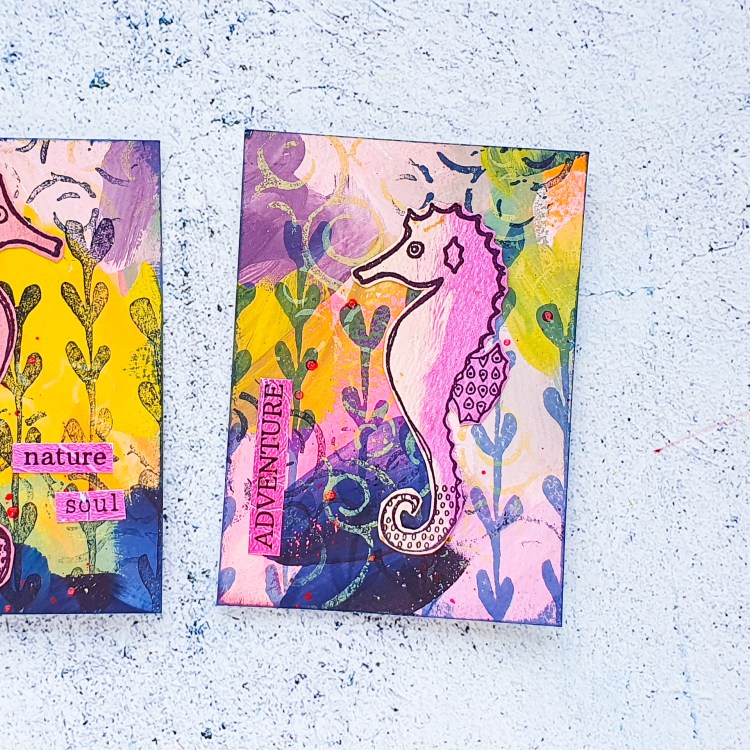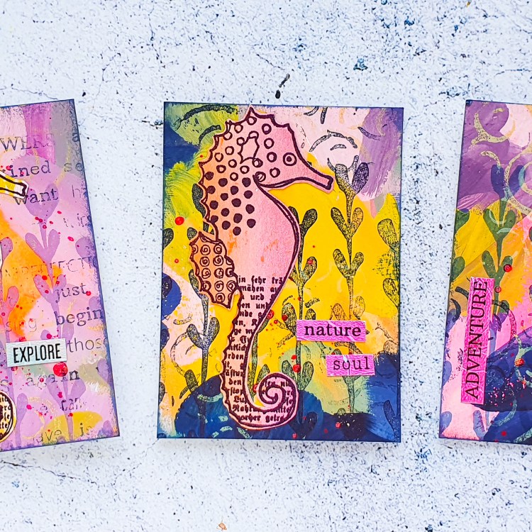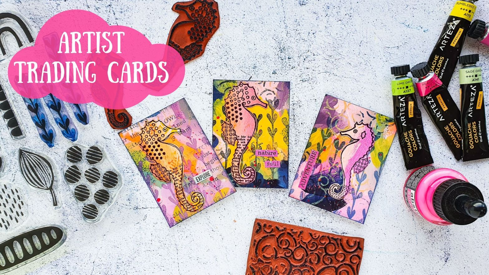 In today’s video I am creating three easy artist trading cards from a gouache background. As my Arteza gouache starting to dry out completely in their tubes I decided to use them as much as I can. I am working with our Carved Collection #1 and Textured Sea Creatures stamps sets.