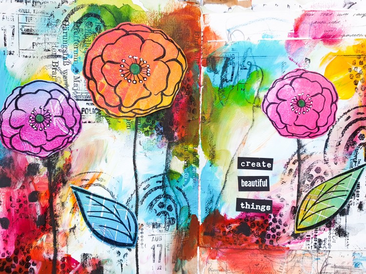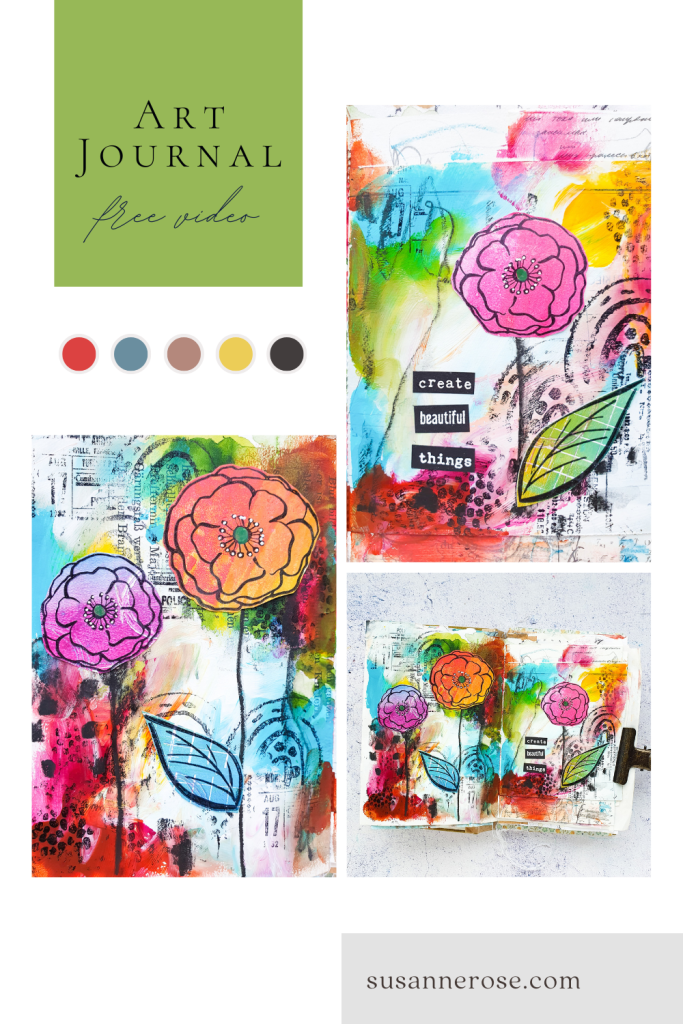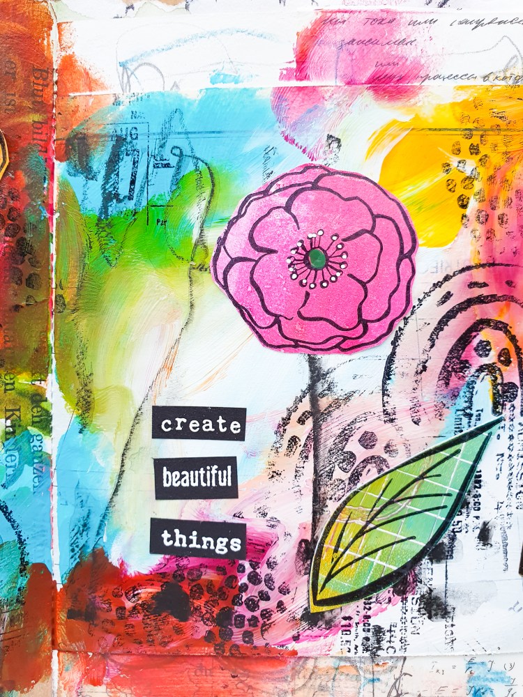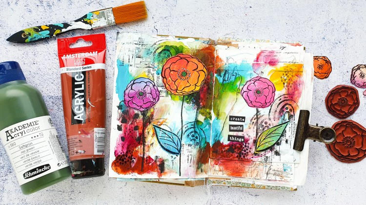Today’s video is all about creating a beauiful abstract background with acrylic paints and some stamps. I am creating an easy spread in my handmade junk art journal. My main images are some flower and leaf stamps from my Loose Florals 2 stamp set.