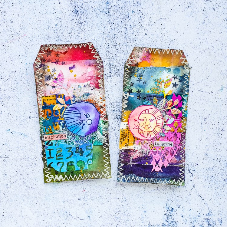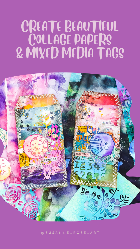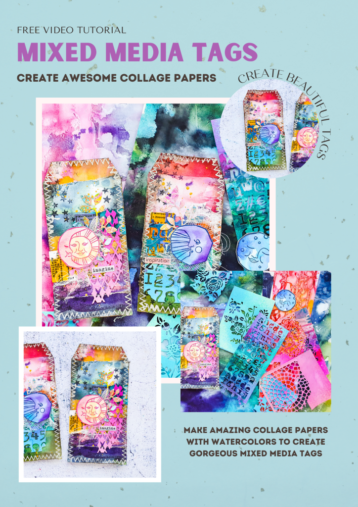 Heute dreht sich alles um Collage und selbst bemalte Collagepapiere. Ich verwende Aquarellfarben und Acryltinten auf grundiertem Newsprint Papier. Dabei erhält man wunderschöne Hintergründe, die sich prima für allerlei Projekte eignen. Außerdem zeige ich im Video noch wie ich Collage-Elemente mit Hilfe von Stempeln und Stanzen mache und wie diese beiden Tags entstehen.
