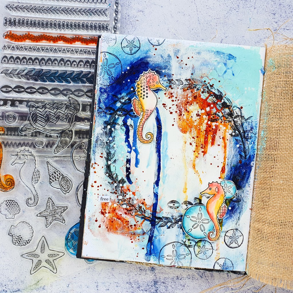 Auf dieser Art Journal Seite hab ich Acrylfarben für den Hintergrund verwendet und außerdem meine Textured Sea Creatures und Mixed Media Borders Stempelsets. Ich habe im Art Journal von Dina Wakley gearbeitet. Ich mag dieses Sketchbook, da es viele verschiedene Papiere beinhaltet.