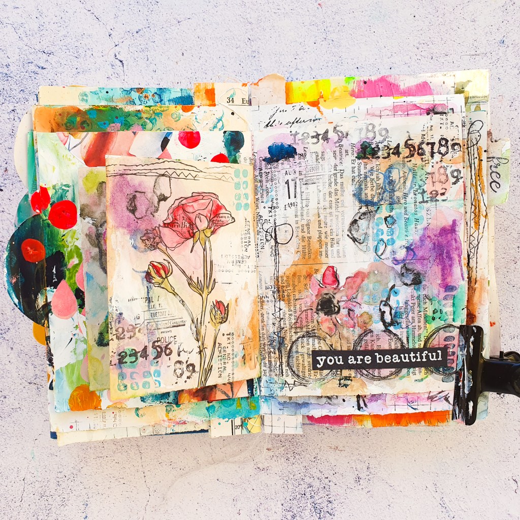 Auf diesen Seiten im handgemachten Junk Art Journal habe ich mein Flowers Gone Wild Stempelset für die Hauptmotive der Layouts verwendet. Die Texturen im Hintergrund sind mit den Mixed Media Marks #1, Grungy Sequins und Pencil Marks #1 Stempelsets entstanden.