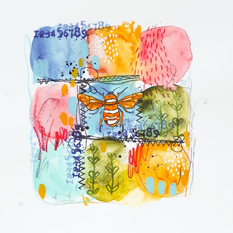 Inktober Day 19 – abstract watercolor grid page using a lot of stamps and mark making